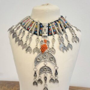 Collana tribale afghana Kuchi con pendenti a mezzaluna e perline colorate
