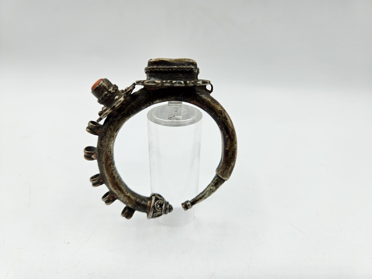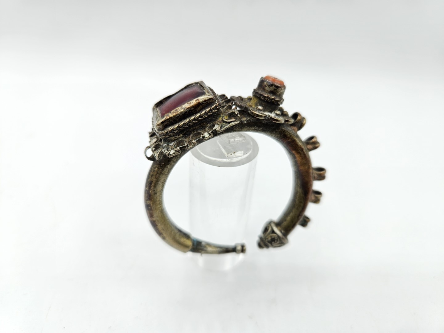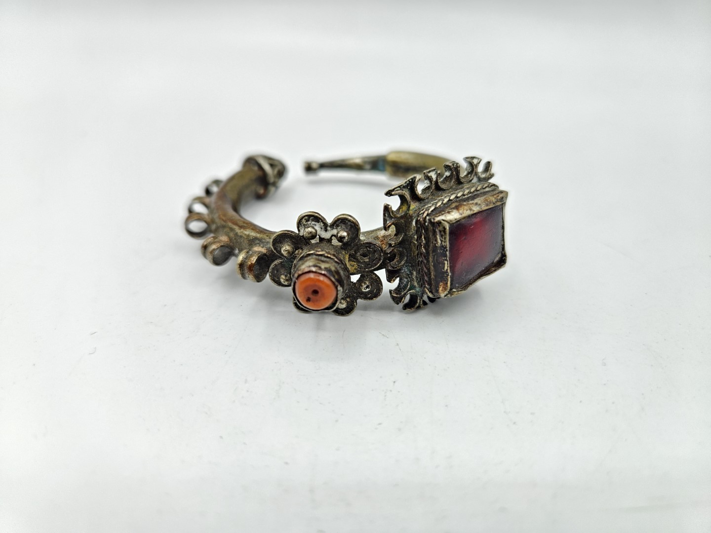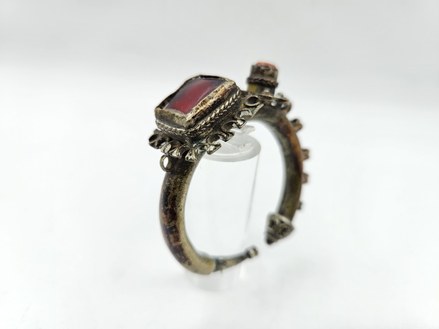 Il pezzo è lavorato in metallo con applicazioni decorative e due castoni: uno rettangolare color rubino e uno più piccolo, tipicamente in vetro o pasta vitrea colorata. La superficie presenta una patina autentica che racconta il lungo uso rituale e quotidiano.