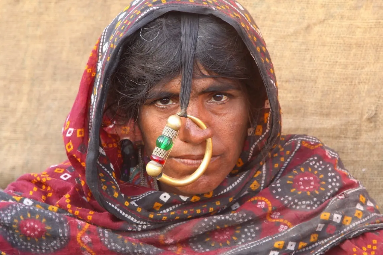 Questi grandi anelli da naso, riccamente decorati, fanno parte dell’ornamento femminile tradizionale e rappresentano status, identità e appartenenza familiare.