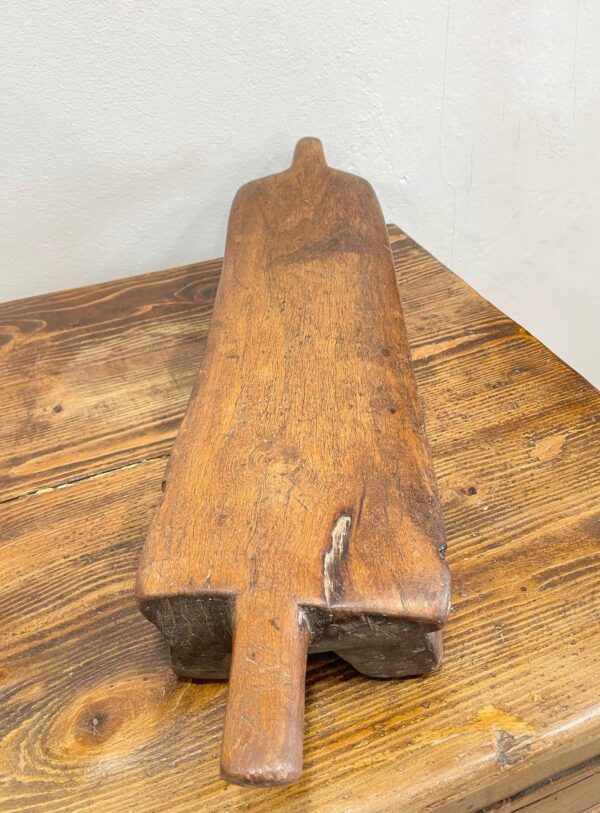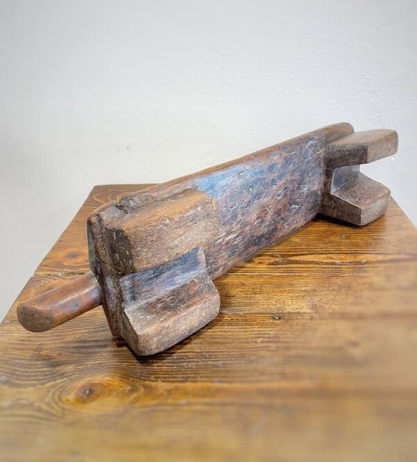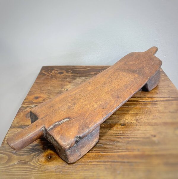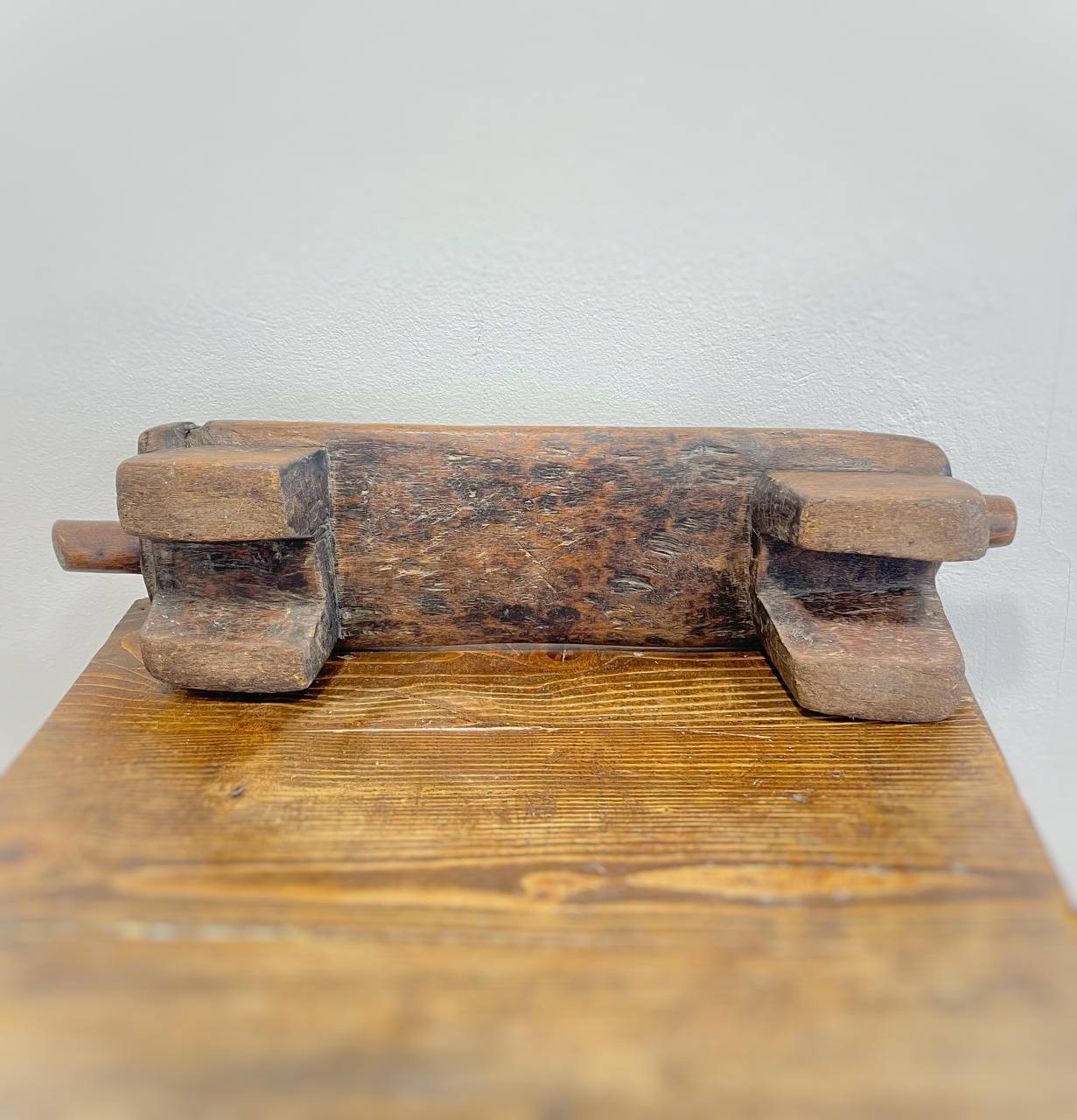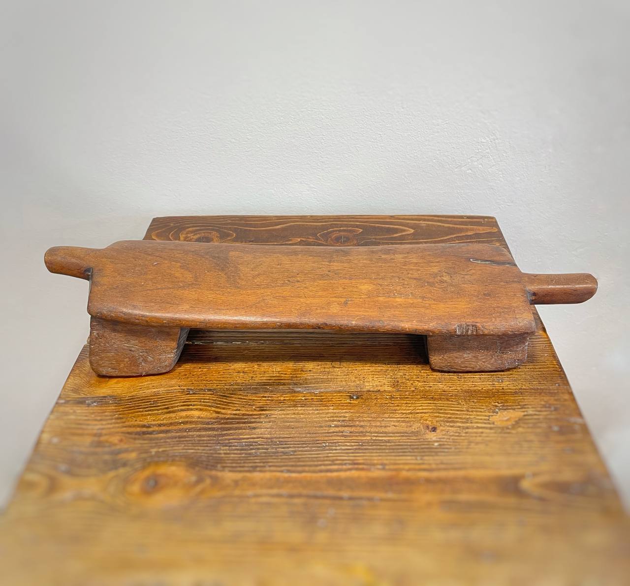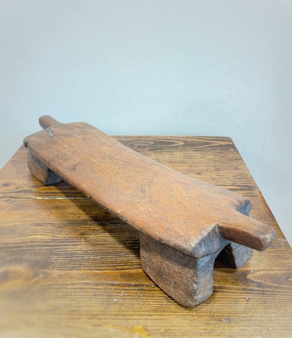 Antico sgabello/poggiatesta tradizionale etiope interamente scolpito a mano in un unico pezzo di legno massello. La struttura, dalle linee robuste e scolpite con precisione, mostra due solidi supporti laterali e una superficie leggermente concava, segno del suo uso quotidiano nelle abitazioni rurali dell’altopiano etiope. Oggetto d’uso personale e simbolico, lo sgabello rappresentava il prestigio e l’identità del proprietario. La patina scura e le tracce d’usura testimoniano una lunga storia di utilizzo, rendendolo un pezzo di grande autenticità e valore etnografico. Perfetto come oggetto da collezione o elemento d’arredo dal carattere arcaico e tribale.