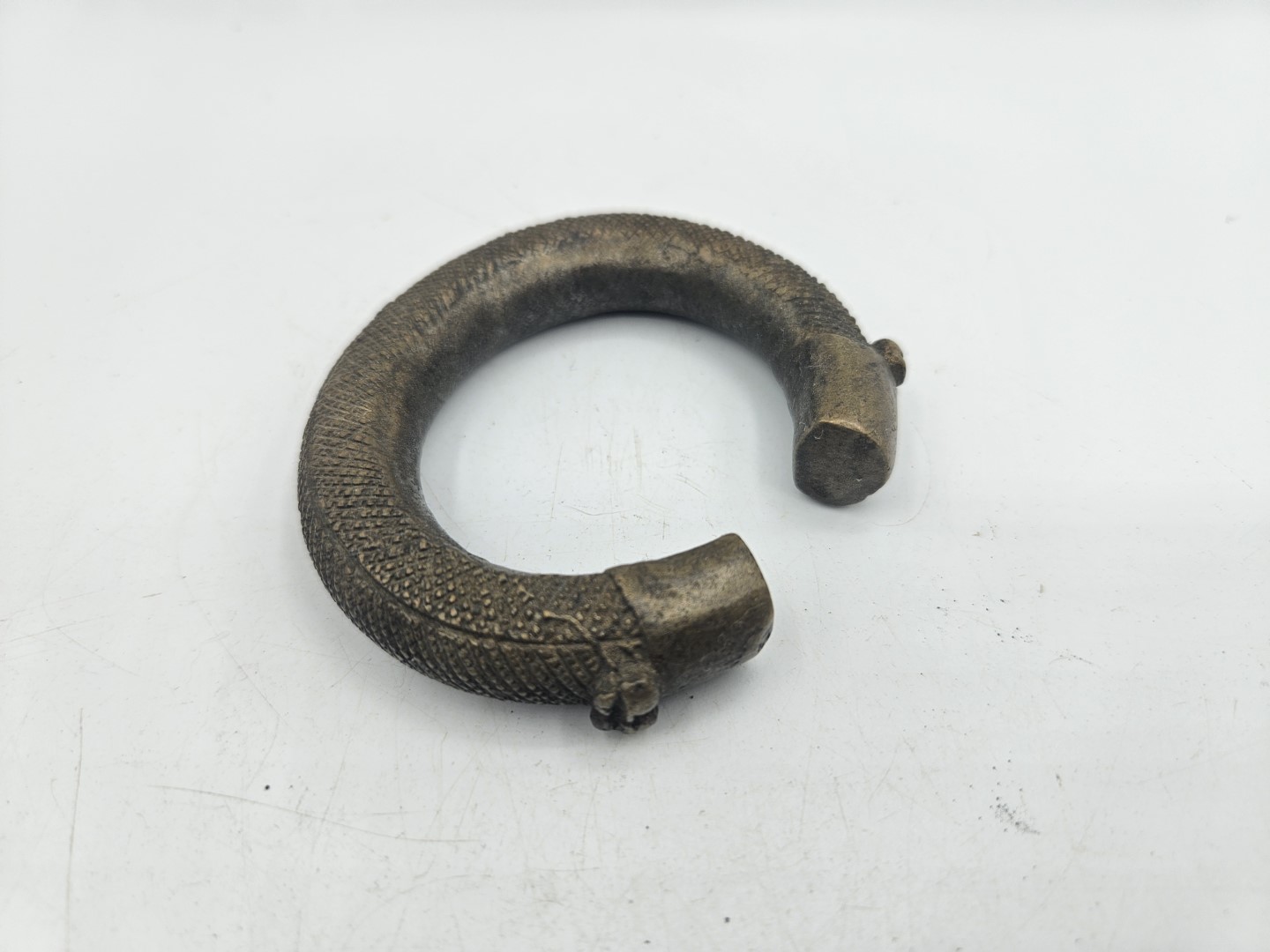 Antico bracciale–moneta in lega di bronzo/ottone, con corpo massiccio a ferro di cavallo e ricca decorazione incisa a motivi geometrici e puntinati. Le estremità presentano terminali squadrati leggermente sporgenti.