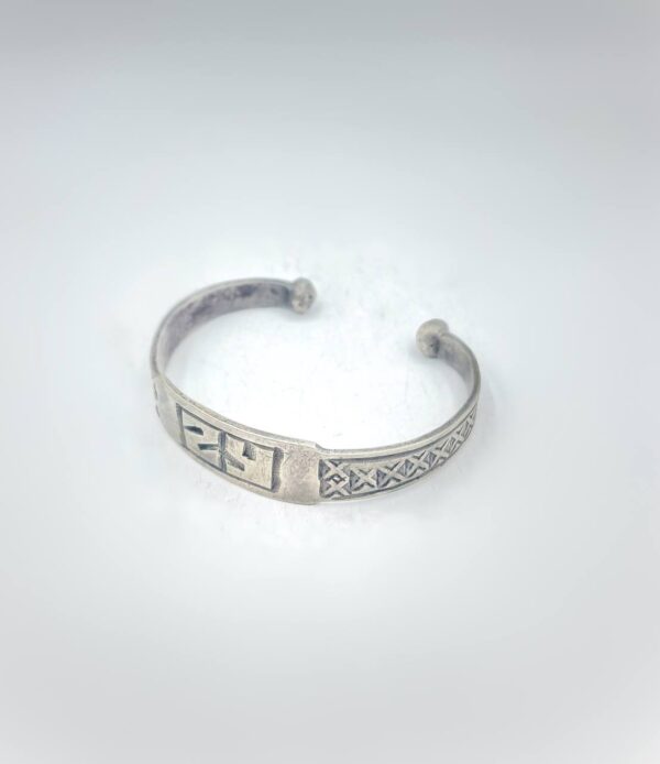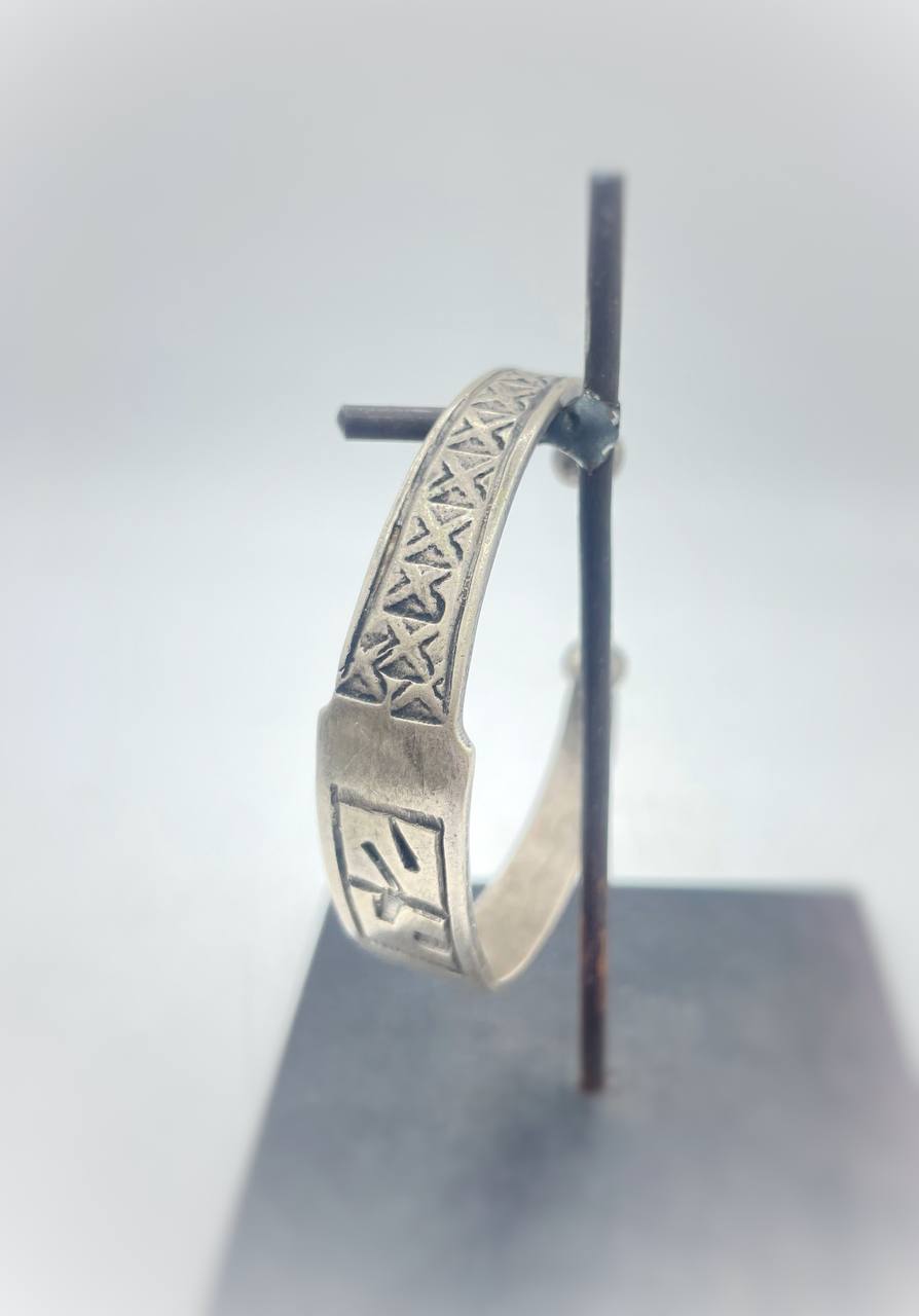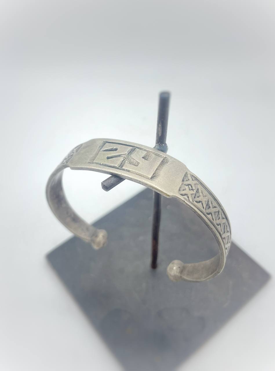 Questo elegante bracciale Tuareg è un esempio autentico dell’oreficeria nomade del Sahara. L’intera superficie è incisa con motivi geometrici a croci incatenate e linee parallele, disegni che richiamano i simboli protettivi utilizzati anche sulle tende e sugli oggetti di uso quotidiano Tuareg.