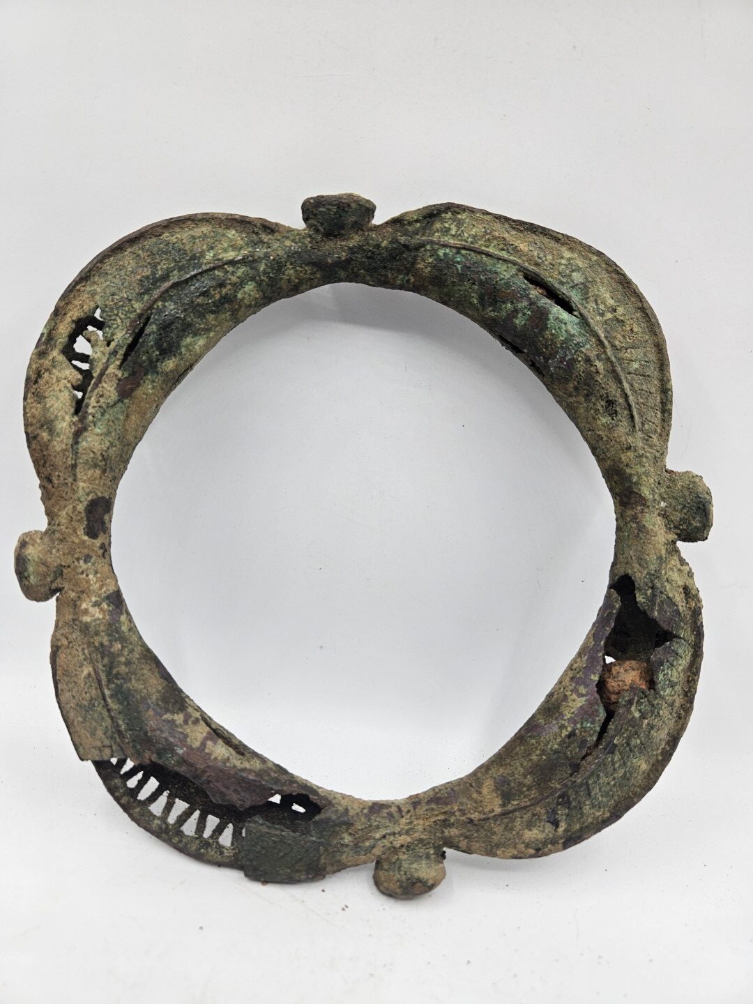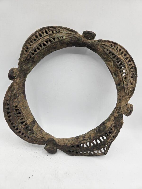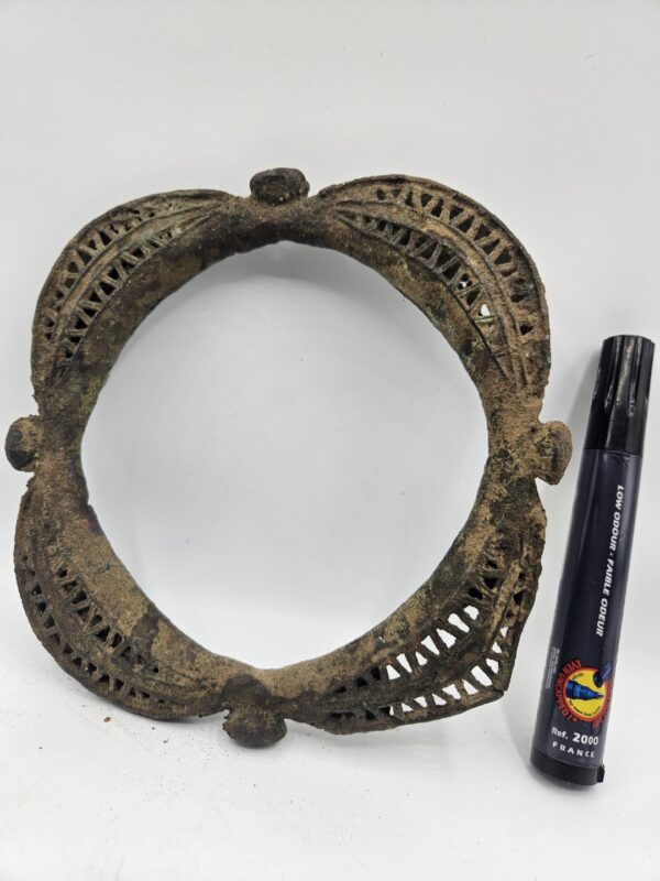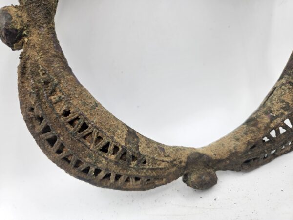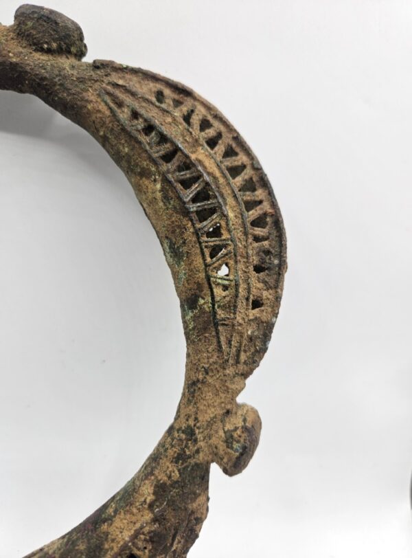 Realizzata con la tecnica della fusione a cera persa, presenta un motivo traforato a triangoli e semicerchi che alleggerisce la massa metallica, creando un delicato effetto decorativo. Le piccole protuberanze sferiche servivano come elementi estetici e, in alcuni casi, per fissare piccoli campanelli o sonagli, oggi perduti.