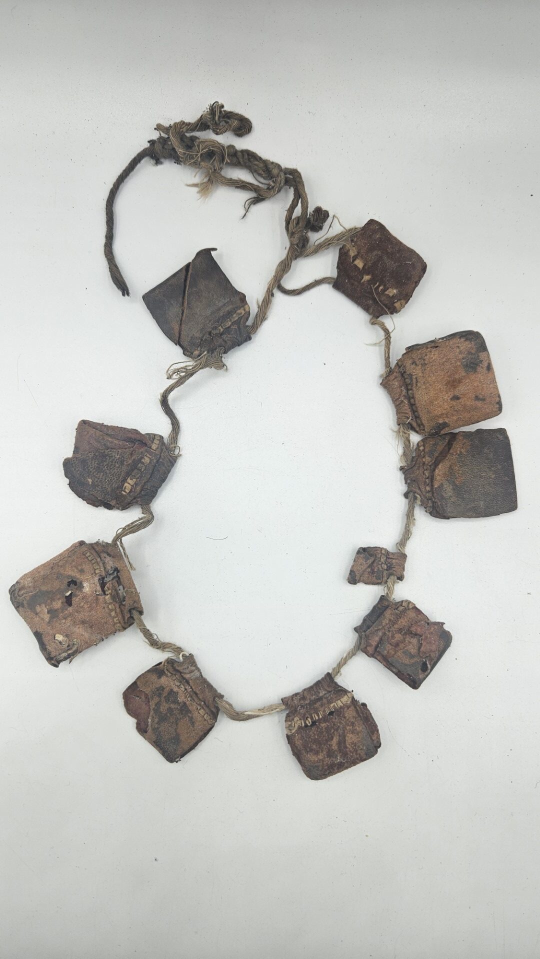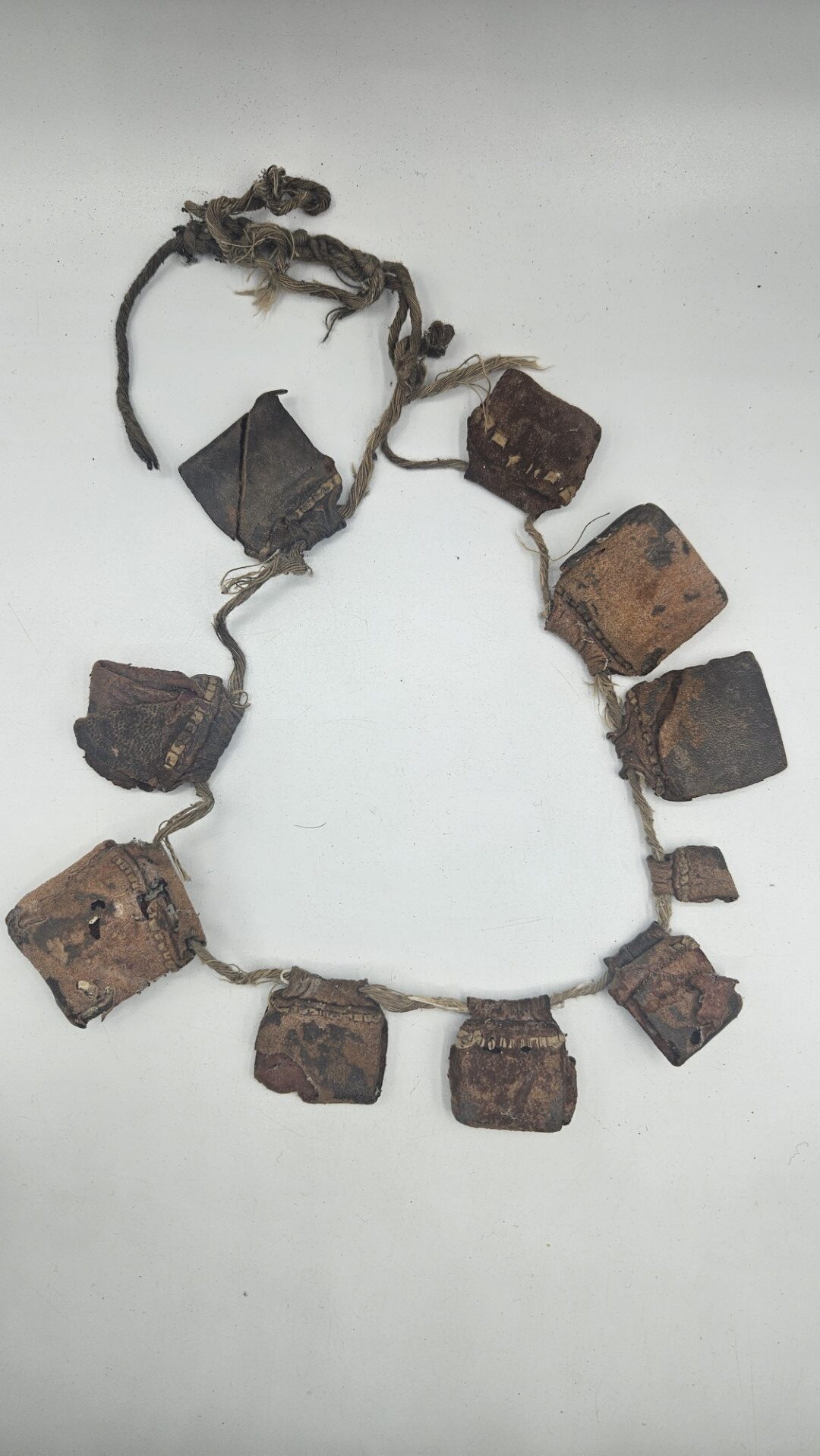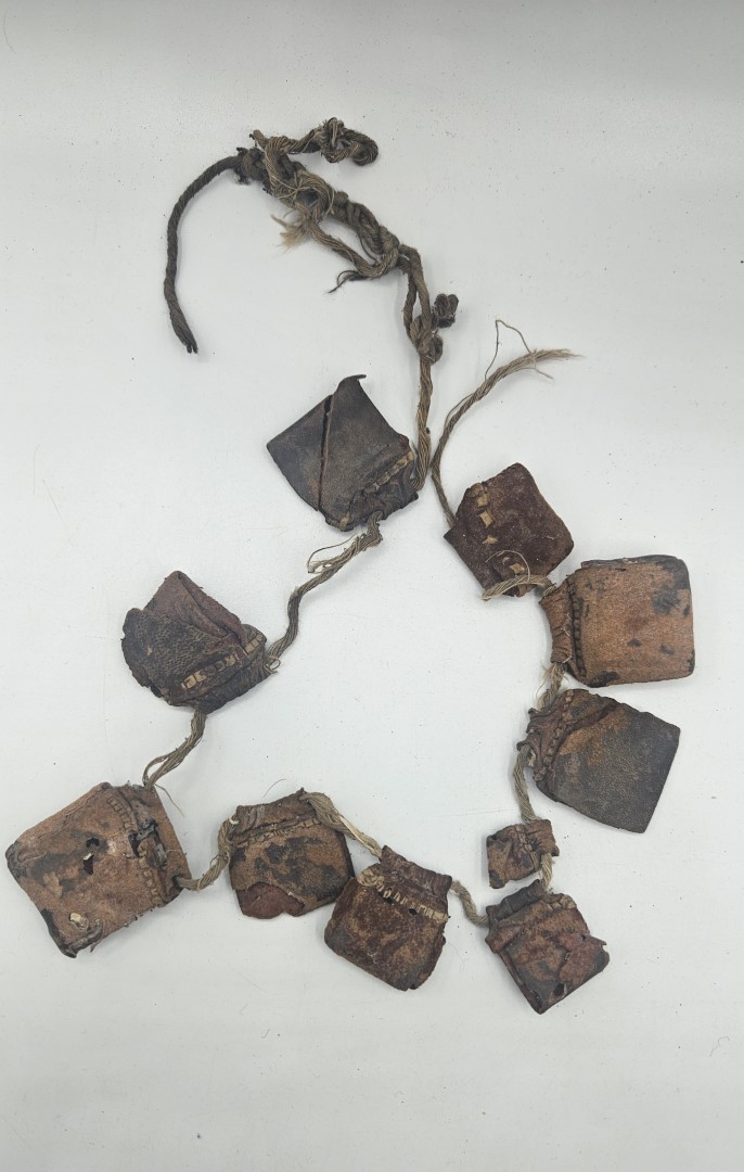Gli amuleti sono realizzati in cuoio naturale lavorato e patinato dal tempo, legati tra loro da corda intrecciata in fibra vegetale/cotone. L’uso prolungato e l’usura diffusa aggiungono autenticità e valore etnografico al pezzo, indicandone il reale utilizzo in contesto quotidiano o rituale.
