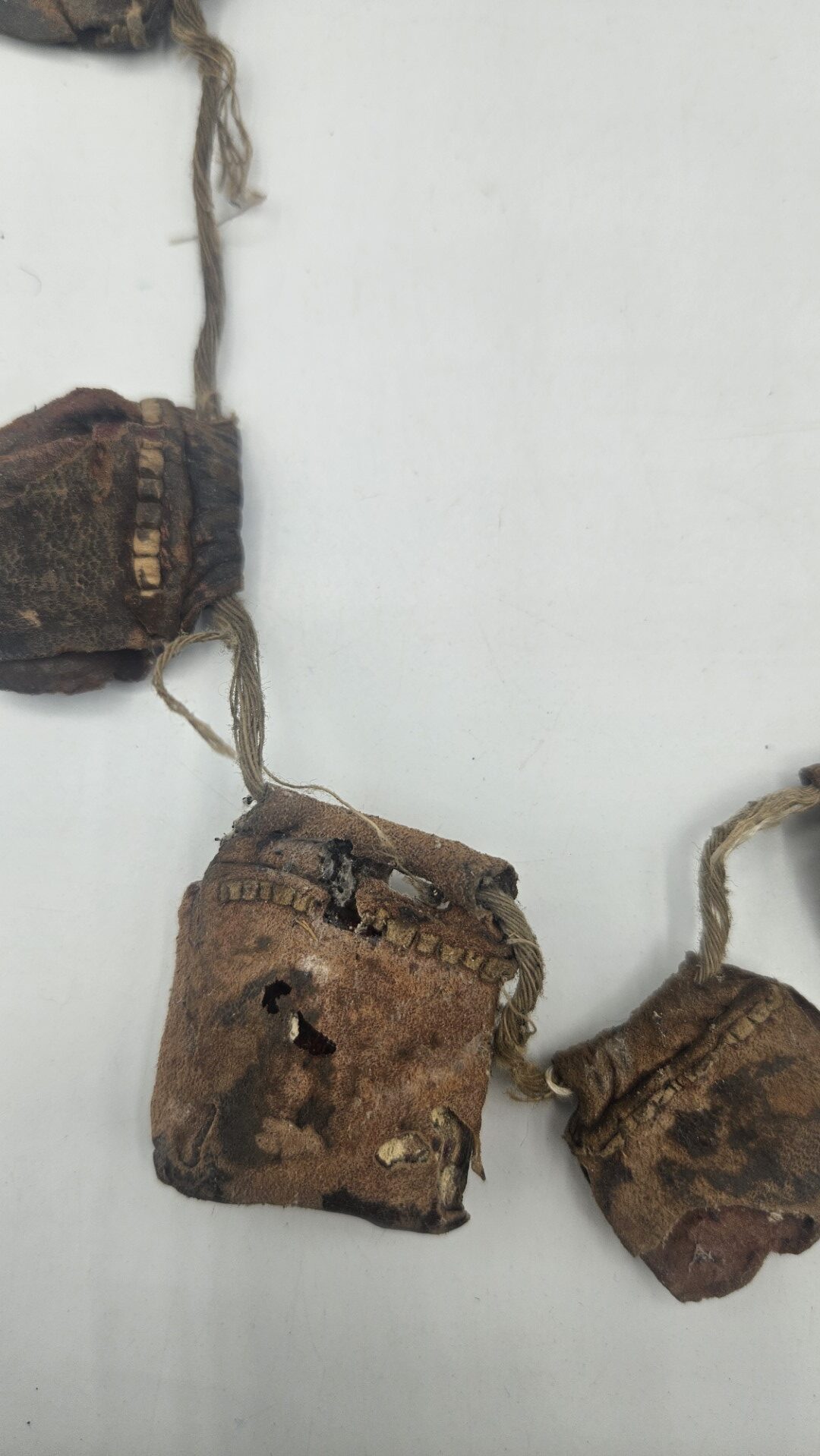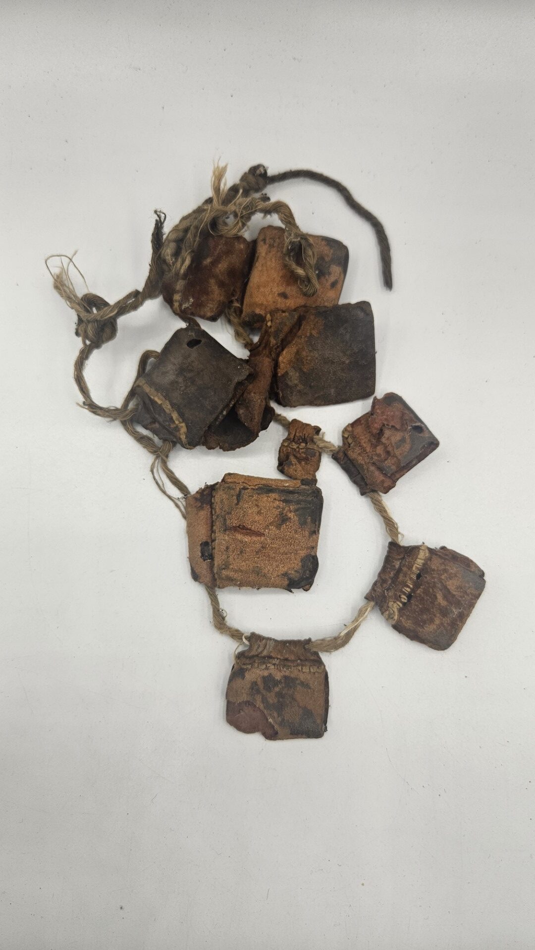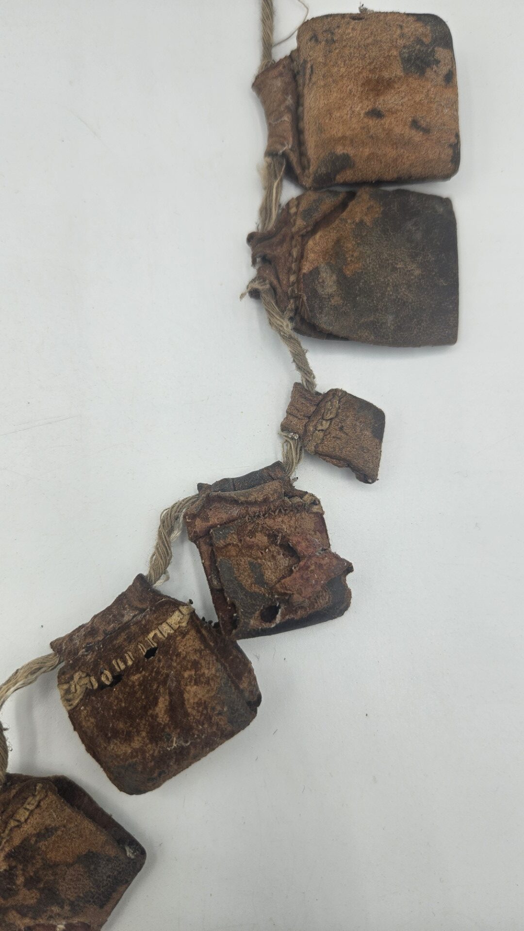 Gli amuleti sono realizzati in cuoio naturale lavorato e patinato dal tempo, legati tra loro da corda intrecciata in fibra vegetale/cotone. L’uso prolungato e l’usura diffusa aggiungono autenticità e valore etnografico al pezzo, indicandone il reale utilizzo in contesto quotidiano o rituale.