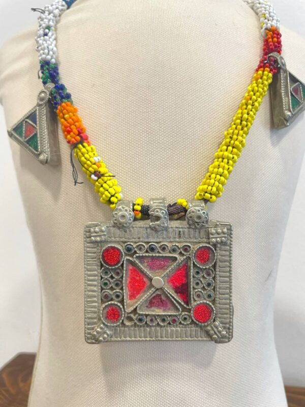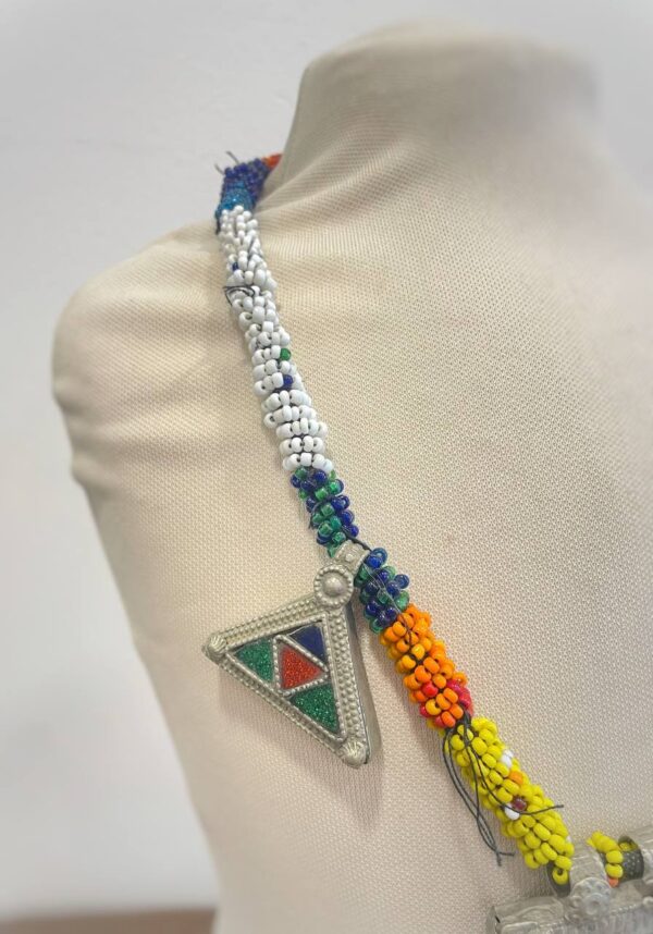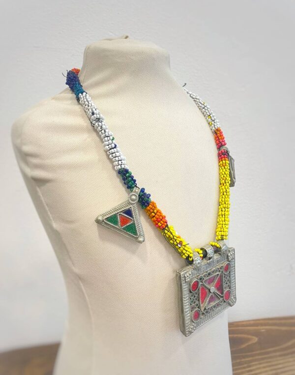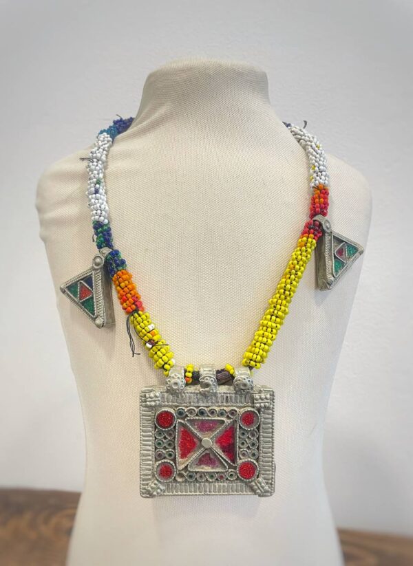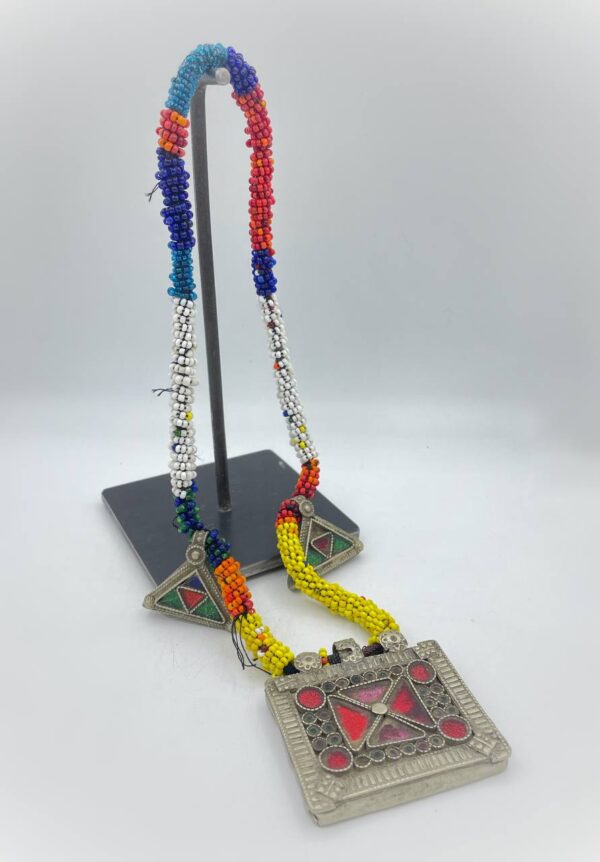 Collana contemporanea di ispirazione tribale afgana, composta da un amuleto quadrato centrale in metallo decorato con vetri colorati rossi e verdi, e due pendenti laterali triangolari. L’amuleto centrale, tipico delle regioni di Kabul e del Khost, riprende la forma dei ta’wiz, antichi portafortuna usati per custodire versi del Corano o formule protettive. La catena, realizzata con fitte perline di vetro multicolore intrecciate a mano, unisce tonalità vivaci di blu, bianco, arancio, rosso, giallo e verde, simbolo di vitalità e armonia. Questo gioiello coniuga tradizione e artigianato moderno, mantenendo i riferimenti iconici delle comunità nomadi dell’Afghanistan e del Pakistan nord-occidentale, ma reinterpretandoli in chiave decorativa contemporanea.