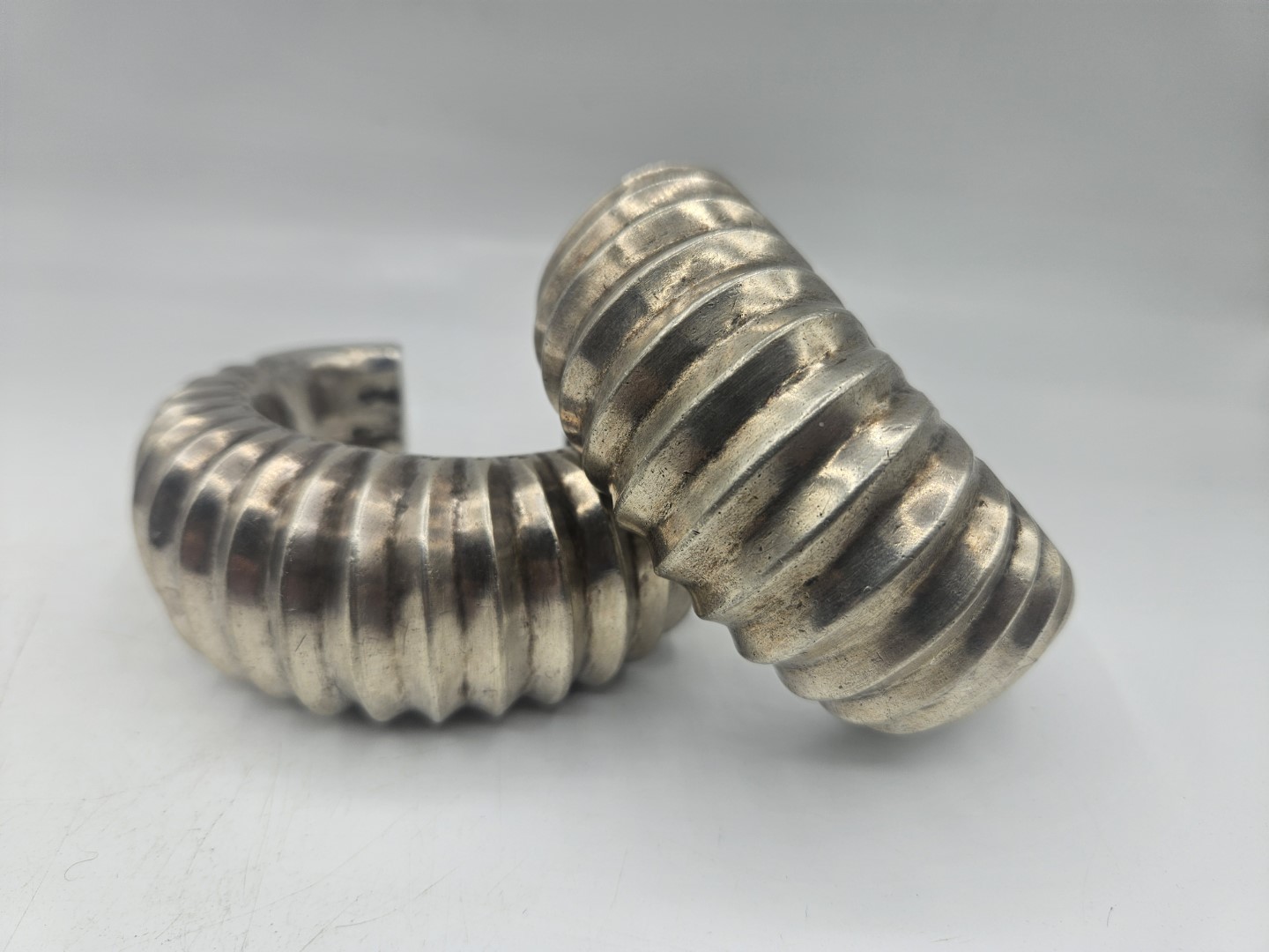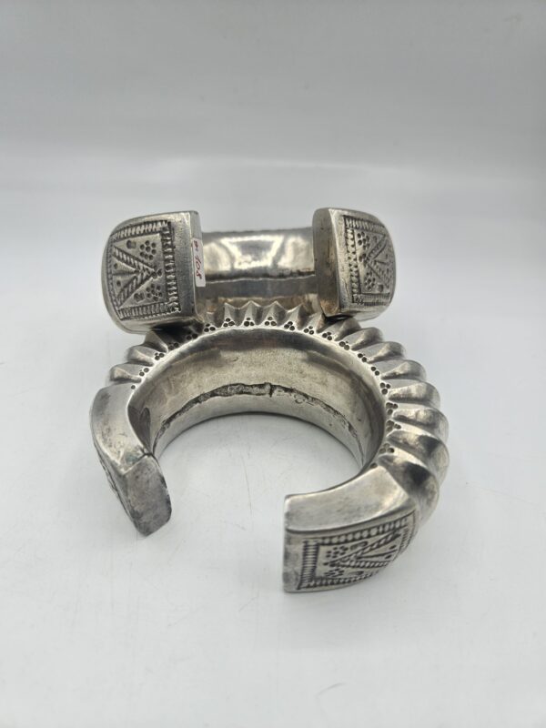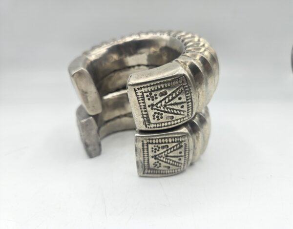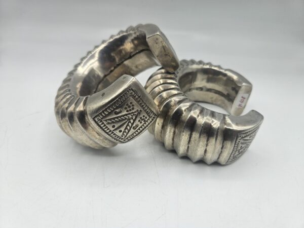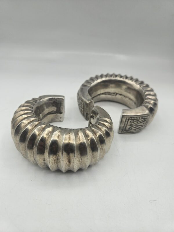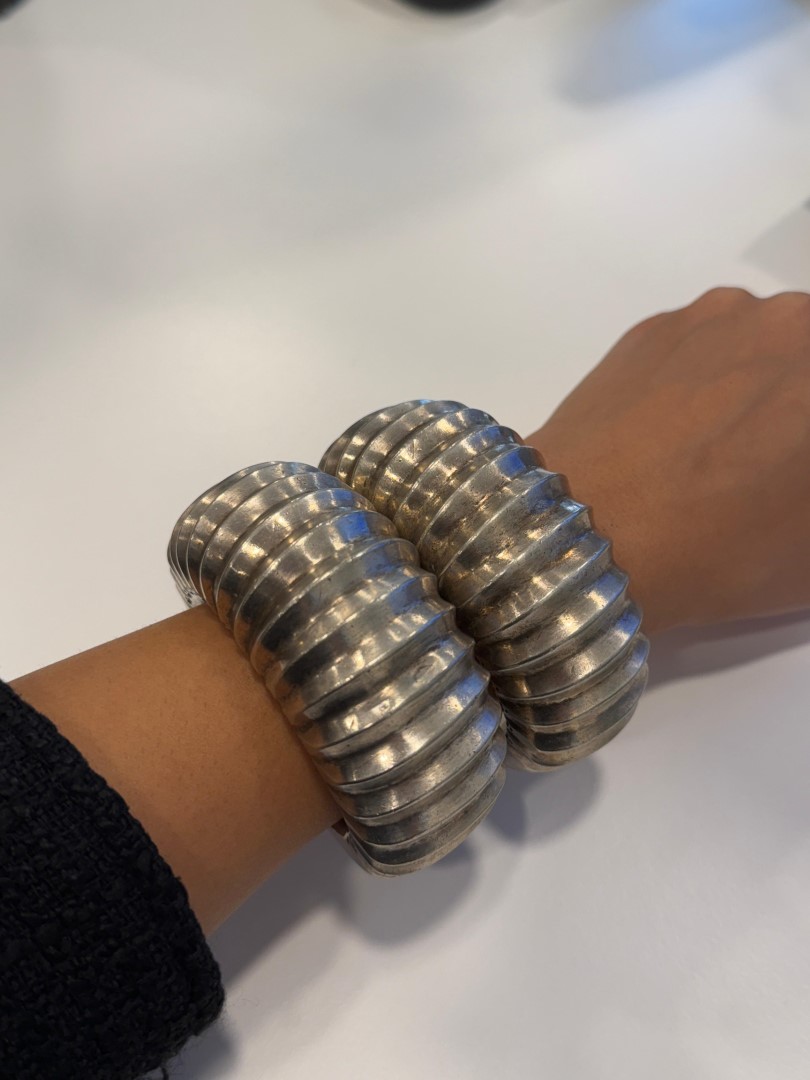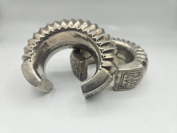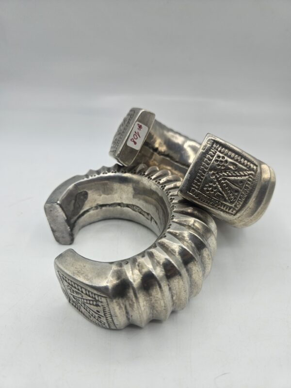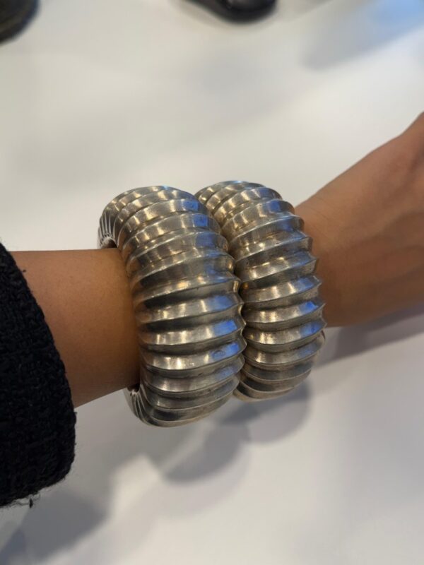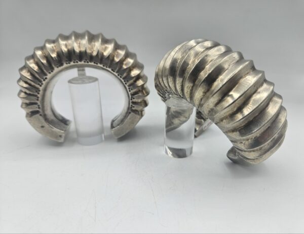 Coppia di rari bracciali tradizionali in argento massiccio provenienti dall’India. Realizzati a mano con un’elegante decorazione a coste e incisioni geometriche, testimoniano l’antica arte orafa delle comunità tribali dell’India centrale e del Rajasthan. Il loro volume e il disegno scolpito indicano un uso cerimoniale e simbolico, spesso legato a doti matrimoniali o status sociale.