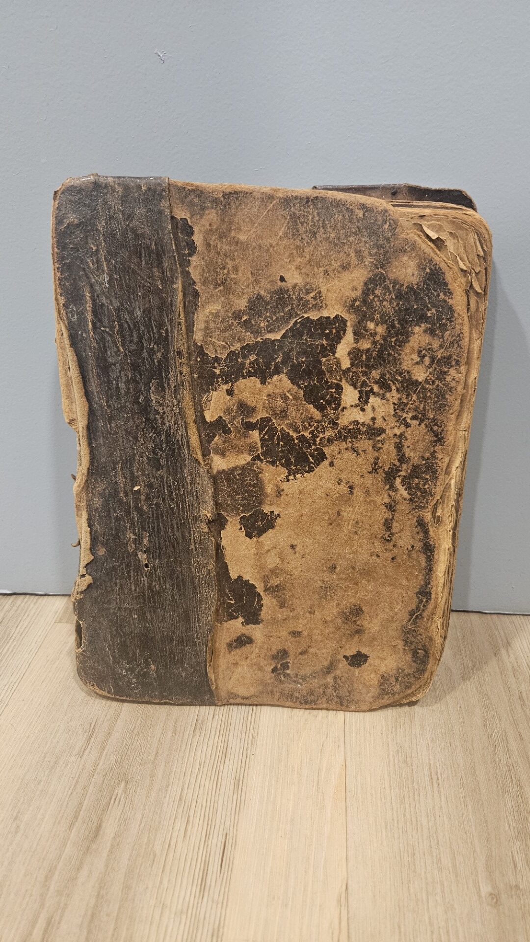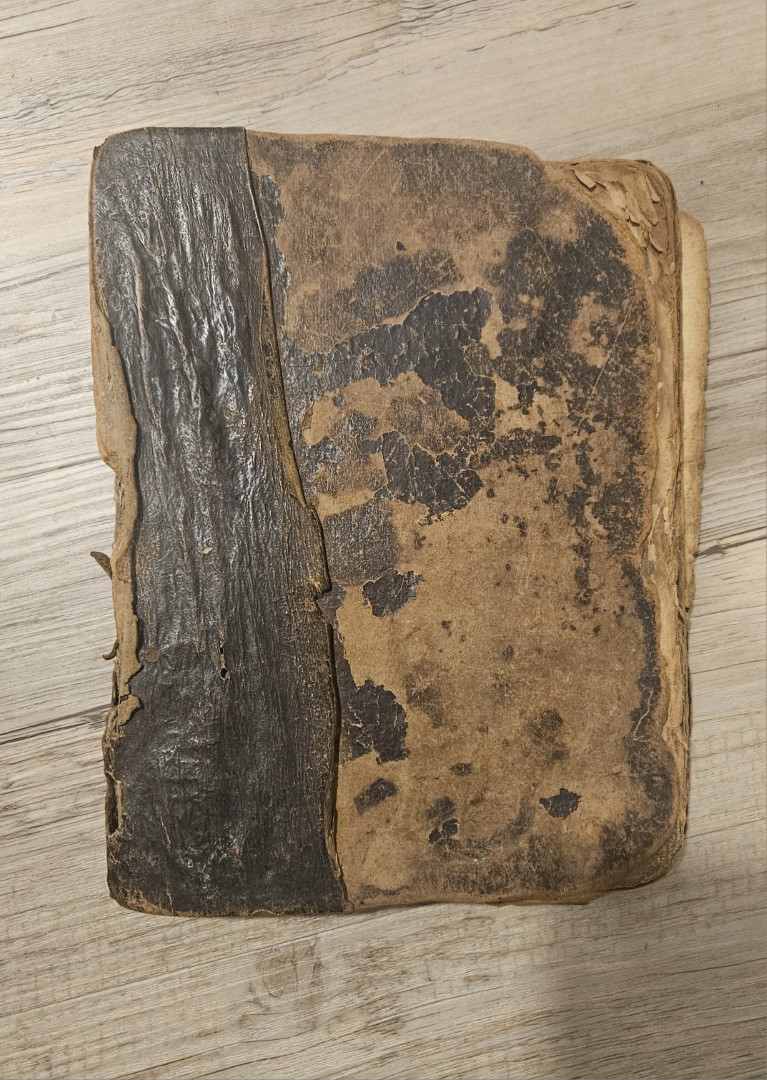 La legatura originale in pelle, oggi fortemente vissuta, presenta un dorso rinforzato e tracce di riparazioni antiche, compatibili con le tecniche artigianali locali. Lo stato di conservazione è autentico e coerente con l’età dell’opera: abrasioni, mancanze marginali e ondulazioni della carta non compromettono la leggibilità e contribuiscono al valore storico e documentario del pezzo.
