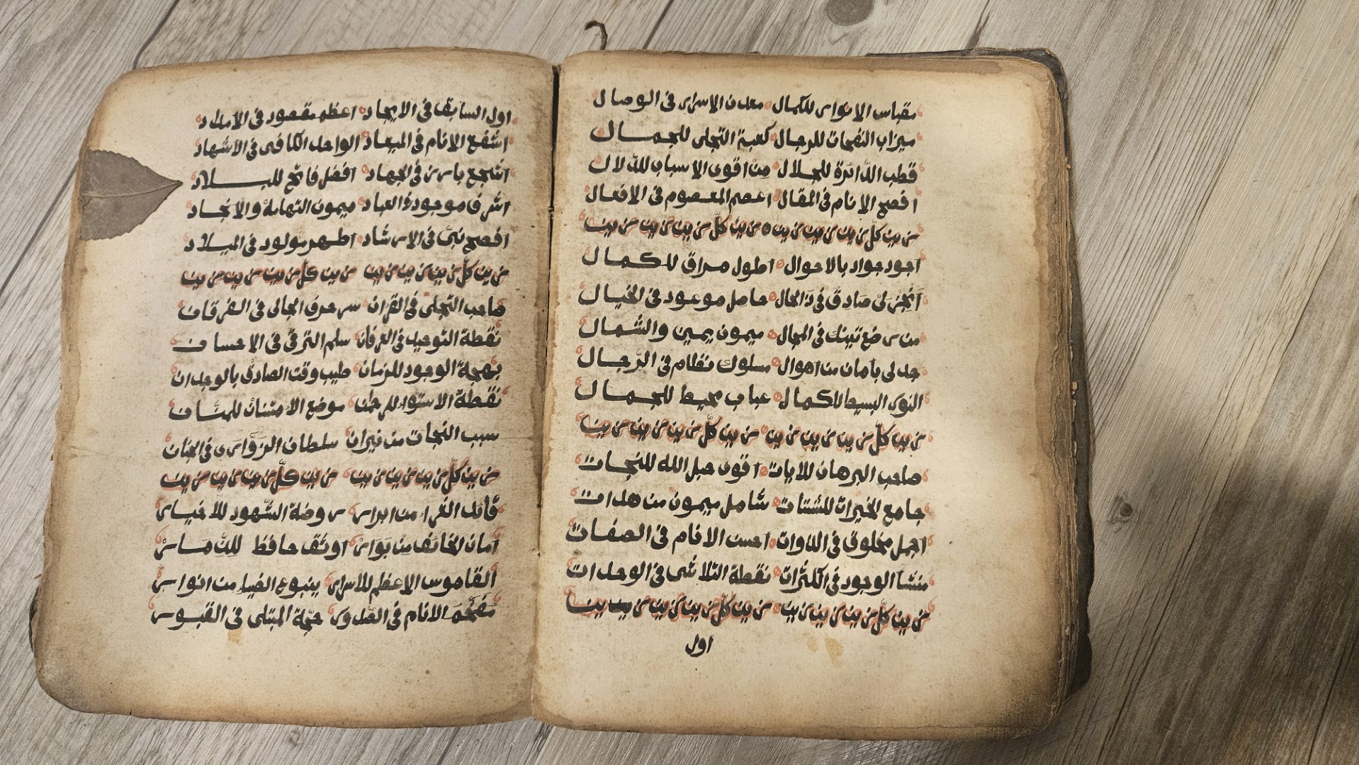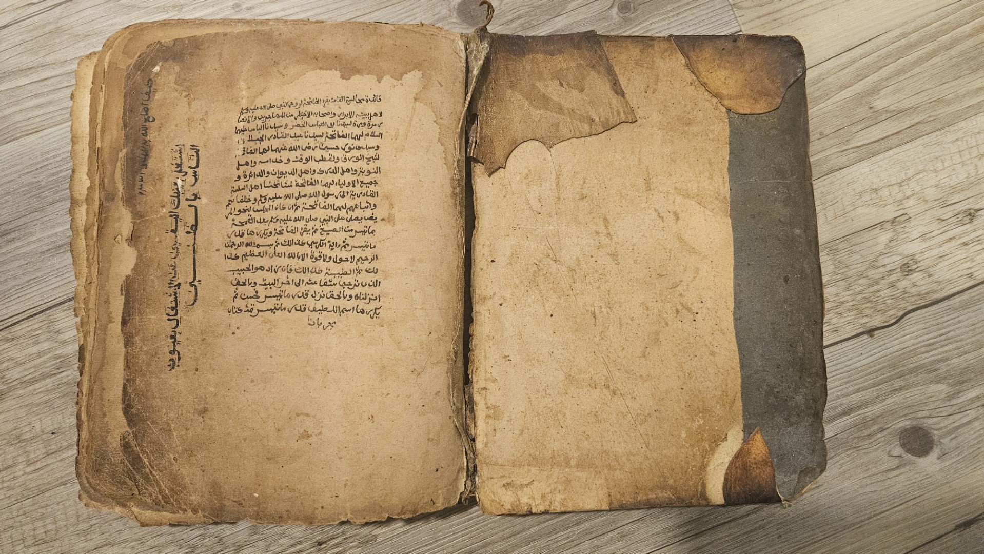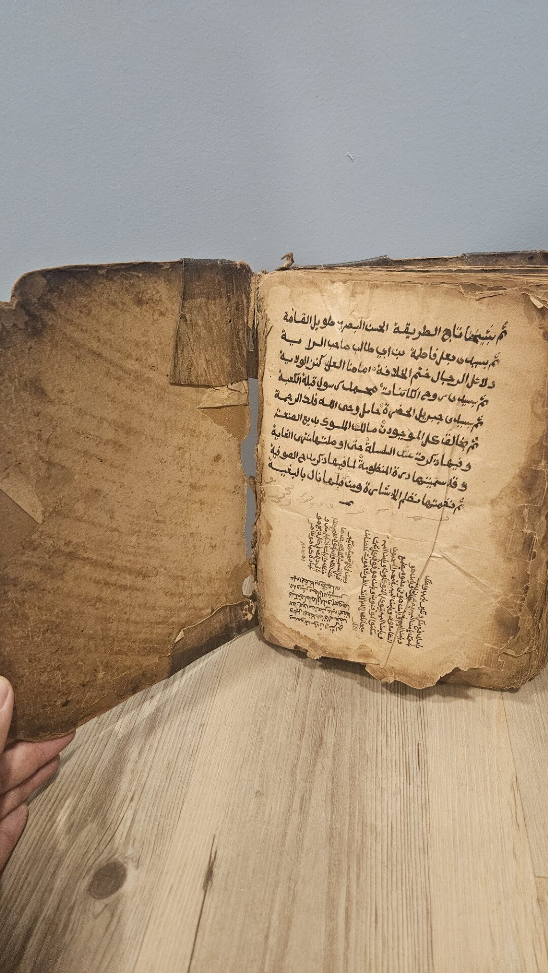 Il testo è scritto in lingua araba con calligrafia sobria e regolare, riconducibile alla tradizione harari, realizzata con inchiostro scuro oggi naturalmente virato verso tonalità brune. La carta artigianale, spessa e fibrosa, è tipica della produzione locale o regionale ottocentesca ed evidenzia i segni di un uso prolungato e autentico.