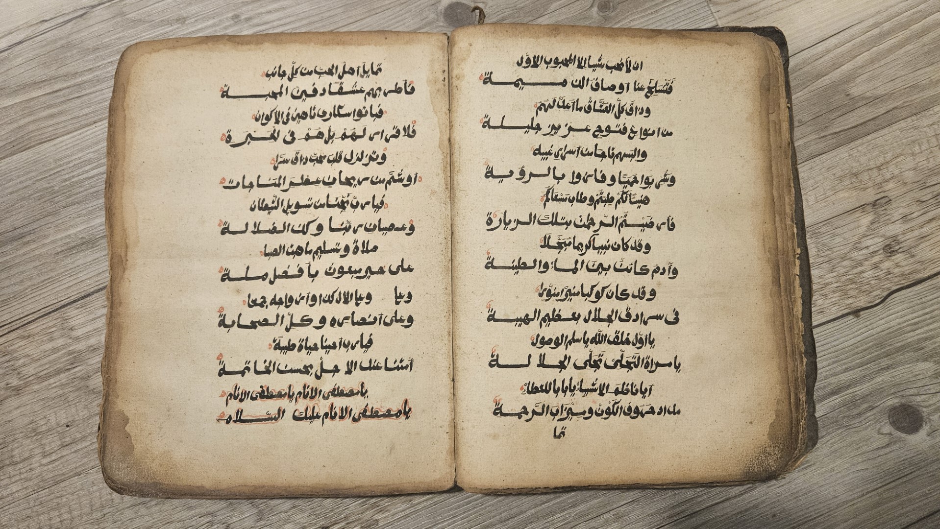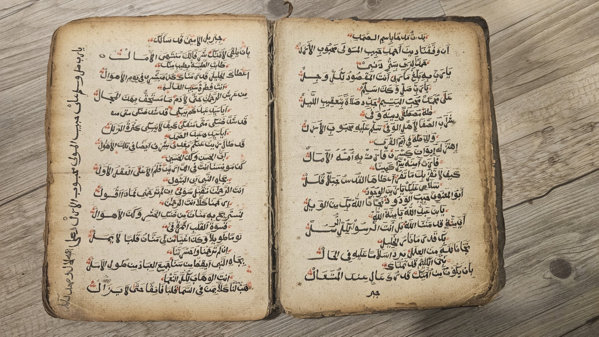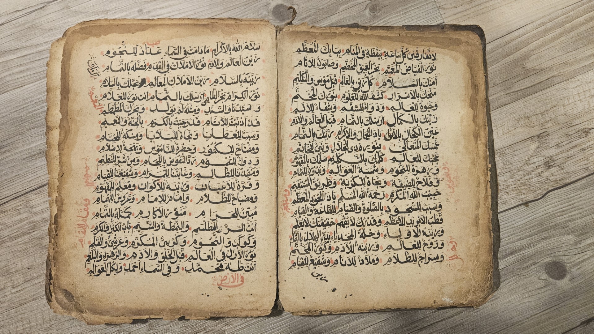 Il testo è scritto in lingua araba con calligrafia sobria e regolare, riconducibile alla tradizione harari, realizzata con inchiostro scuro oggi naturalmente virato verso tonalità brune. La carta artigianale, spessa e fibrosa, è tipica della produzione locale o regionale ottocentesca ed evidenzia i segni di un uso prolungato e autentico.