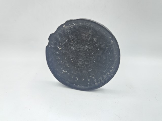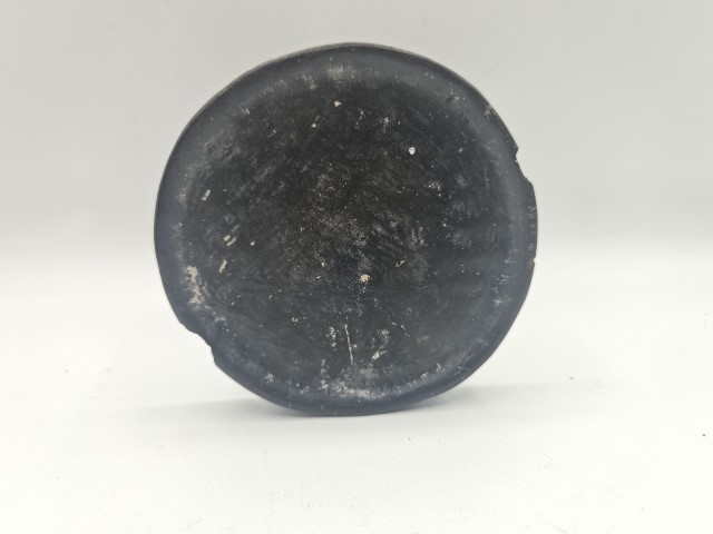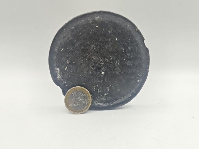 Disco labiale tradizionale del popolo Dinka, Sudan, realizzato in terracotta modellata a mano. L’oggetto mostra una patina scura e una superficie consumata dal tempo, con piccole irregolarità e sbeccature sul bordo tipiche della terracotta antica. La forma è semplice e leggermente irregolare, caratteristica dei manufatti prodotti senza stampi. Esemplare etnografico autentico, testimonia le pratiche estetiche e identitarie delle comunità Dinka.
