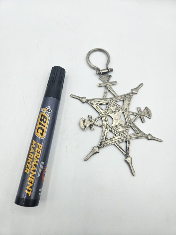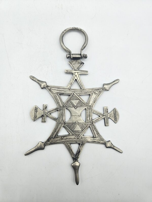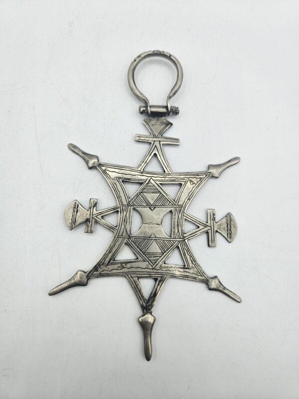 A differenza delle più note croci Tuareg da collo (tanaghilt), appartenenti alla serie canonica delle 21 croci di Agadez, la croce da velo si distingue per le dimensioni considerevoli, l’ampio anello superiore e la struttura complessa arricchita da trafori e incisioni geometriche. Questi elementi non erano semplicemente decorativi, ma veicolavano un forte valore simbolico: protezione, status sociale e identità culturale.