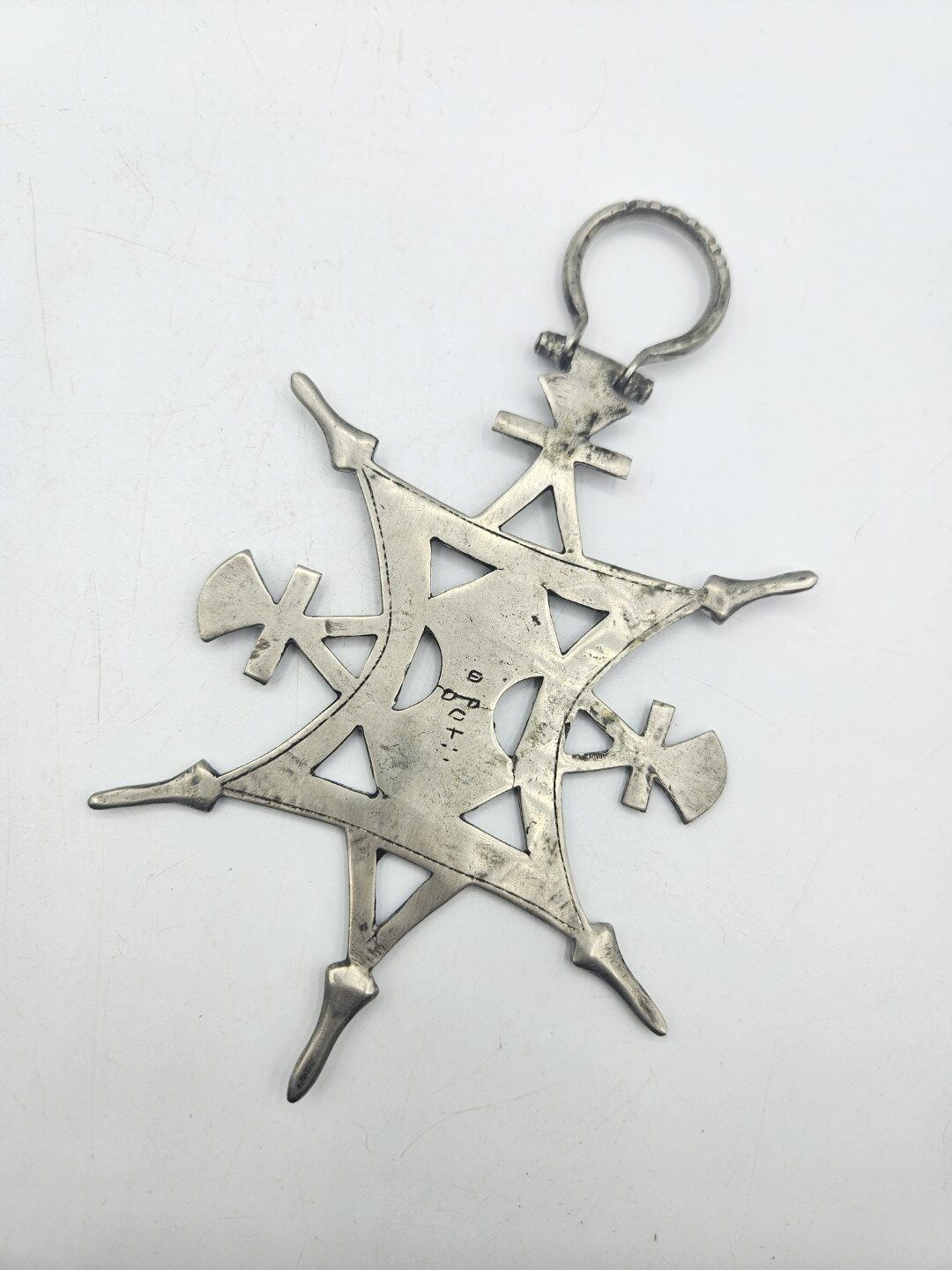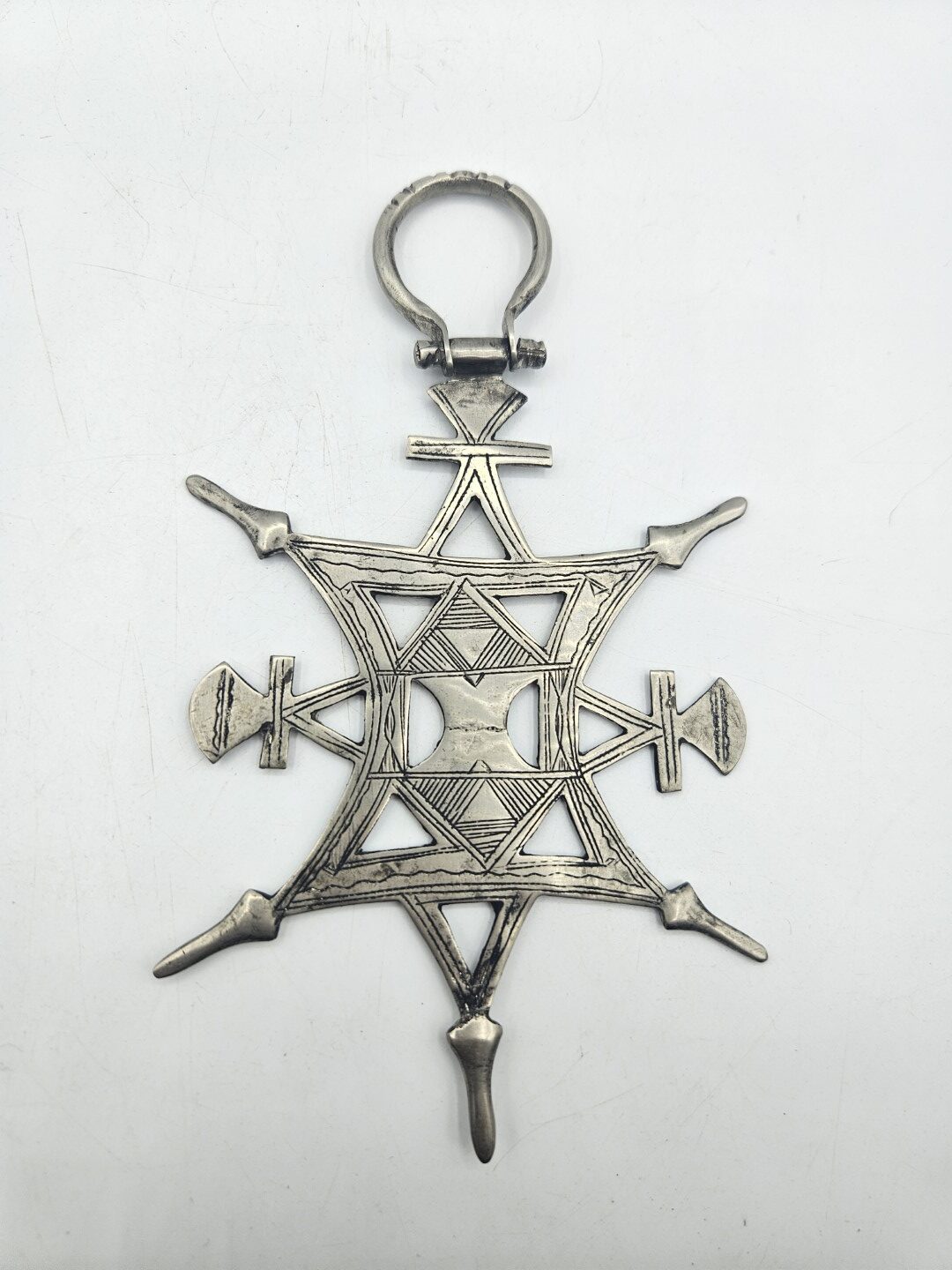 Questo esemplare di grande formato è una croce Tuareg da velo (Assrou n’swoul), appartenente al gruppo dei pendenti cruciformi utilizzati tradizionalmente dalle donne tuareg come ornamento cerimoniale fissato al velo o ai tessuti.