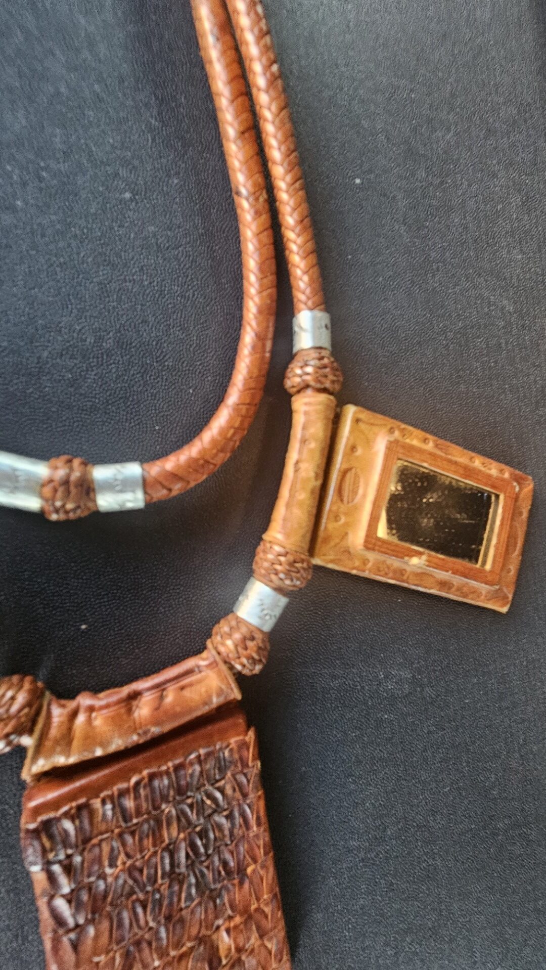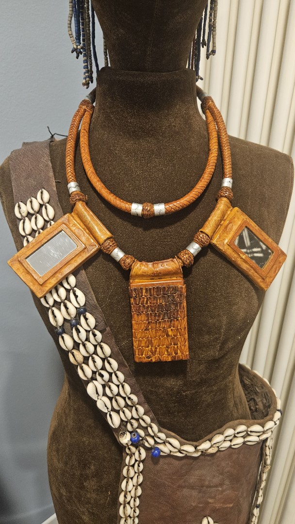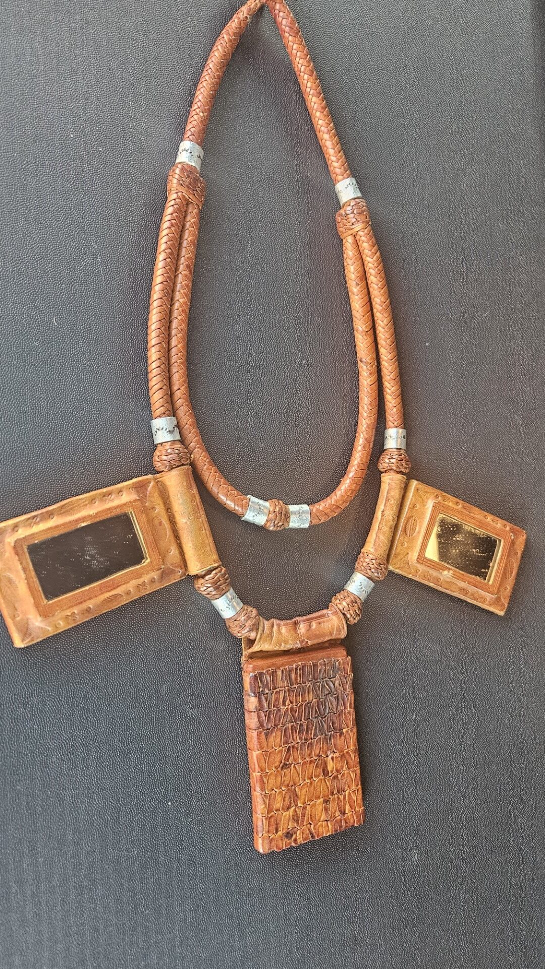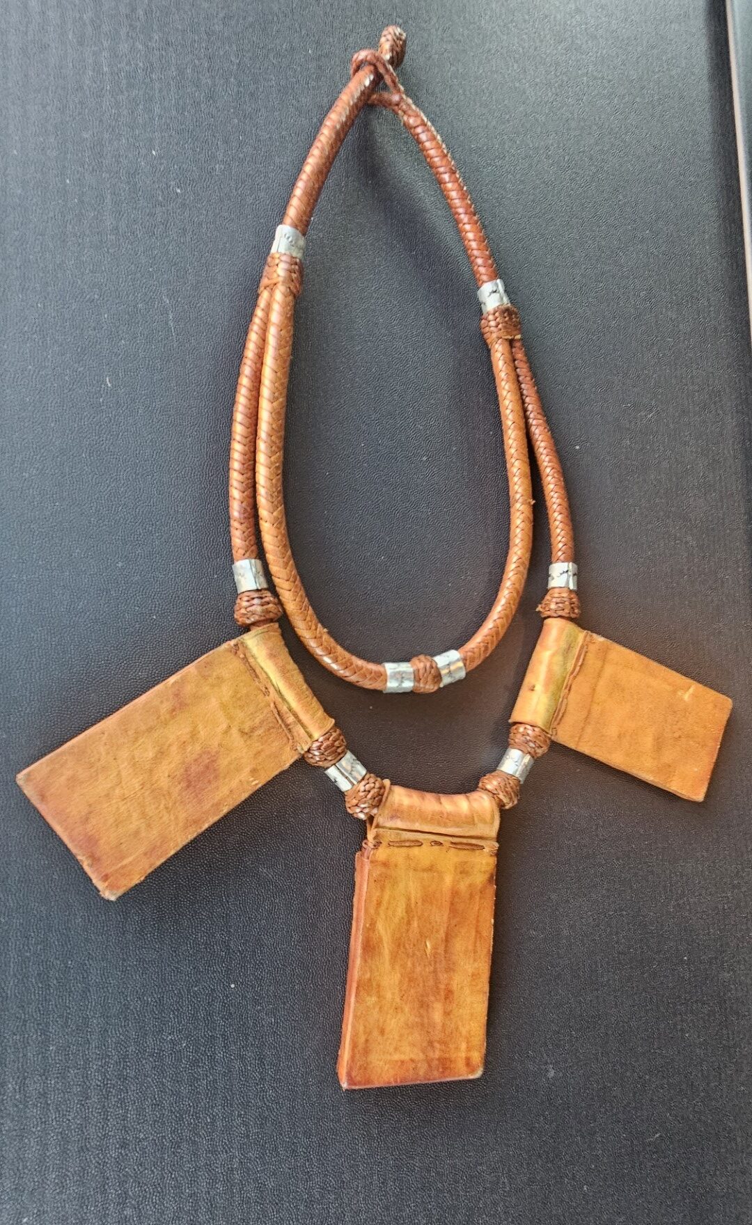 Amuleto gris-gris proveniente dal Mali, realizzato in cuoio intrecciato e cucito a mano, con elementi decorativi in metallo e specchi rituali. Oggetto appartenente alla tradizione dell’Africa occidentale, utilizzato come talismano personale con funzione protettiva e simbolica.