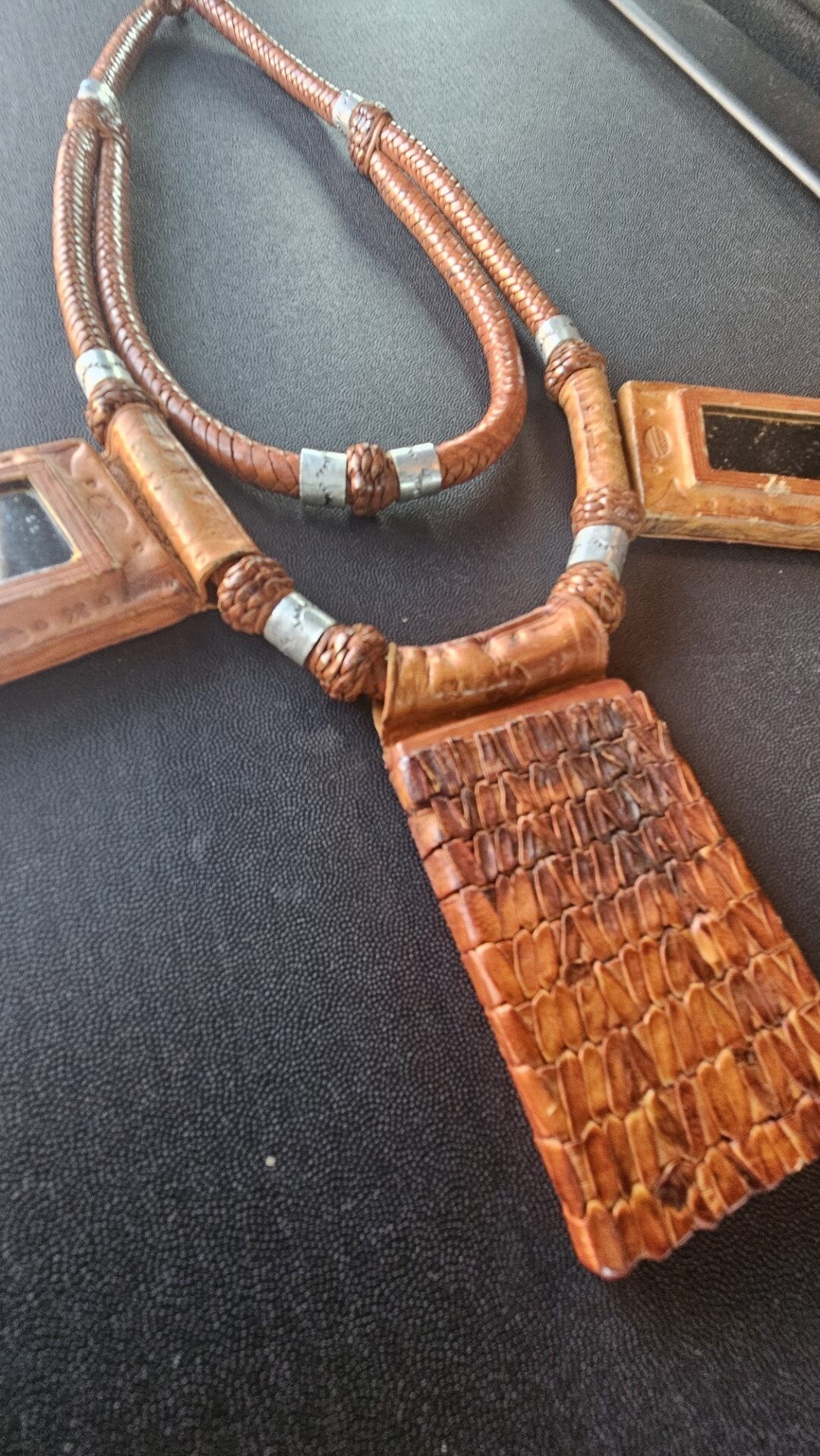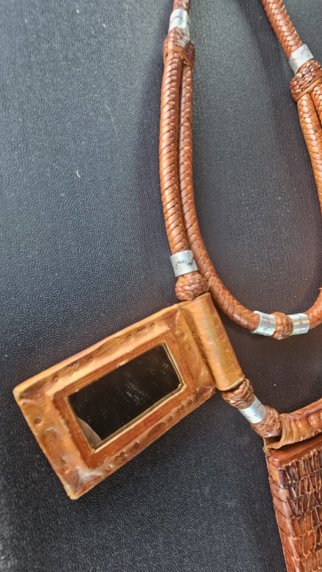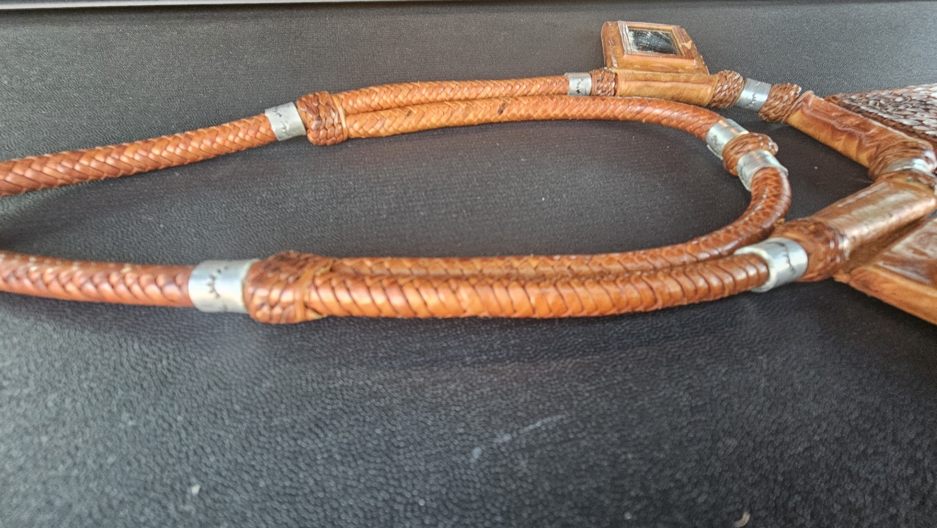 Amuleto gris-gris proveniente dal Mali, realizzato in cuoio intrecciato e cucito a mano, con elementi decorativi in metallo e specchi rituali. Oggetto appartenente alla tradizione dell’Africa occidentale, utilizzato come talismano personale con funzione protettiva e simbolica.