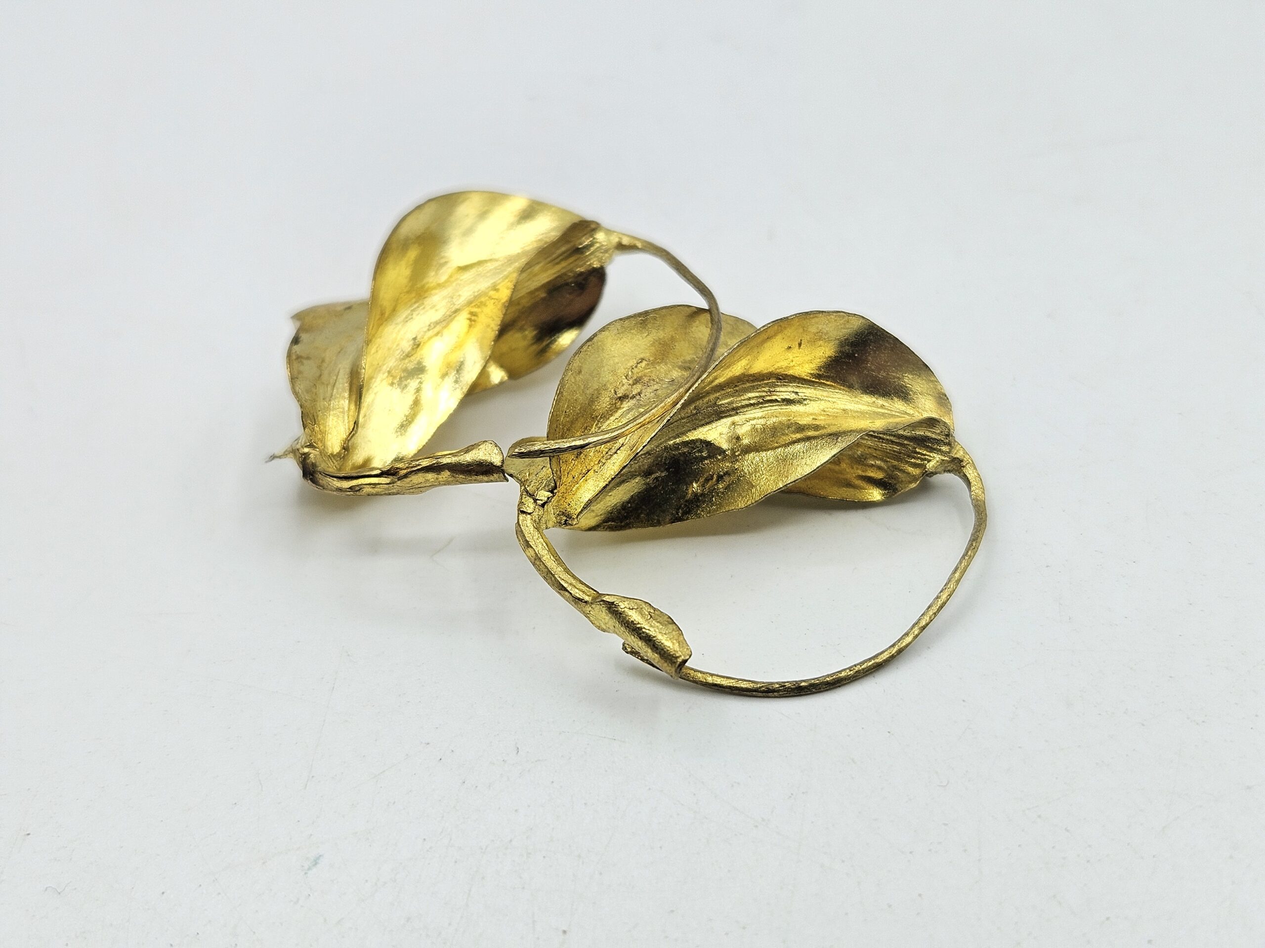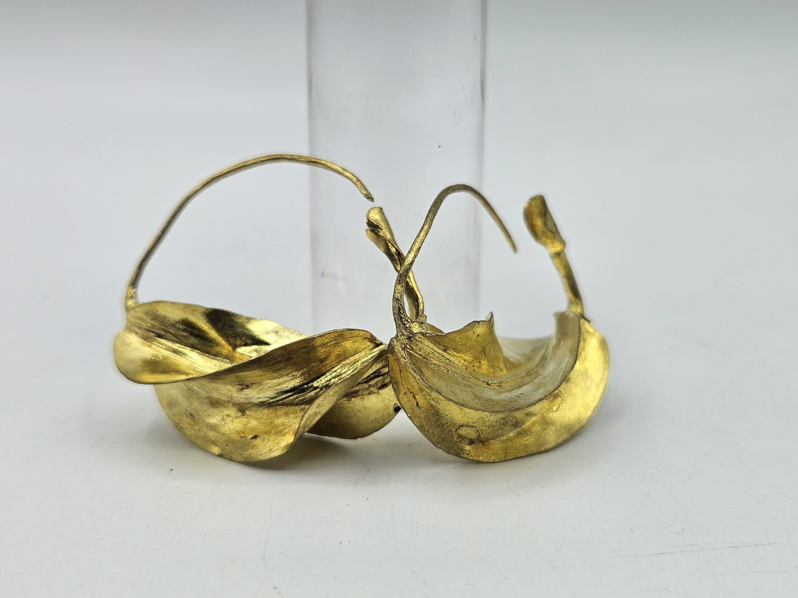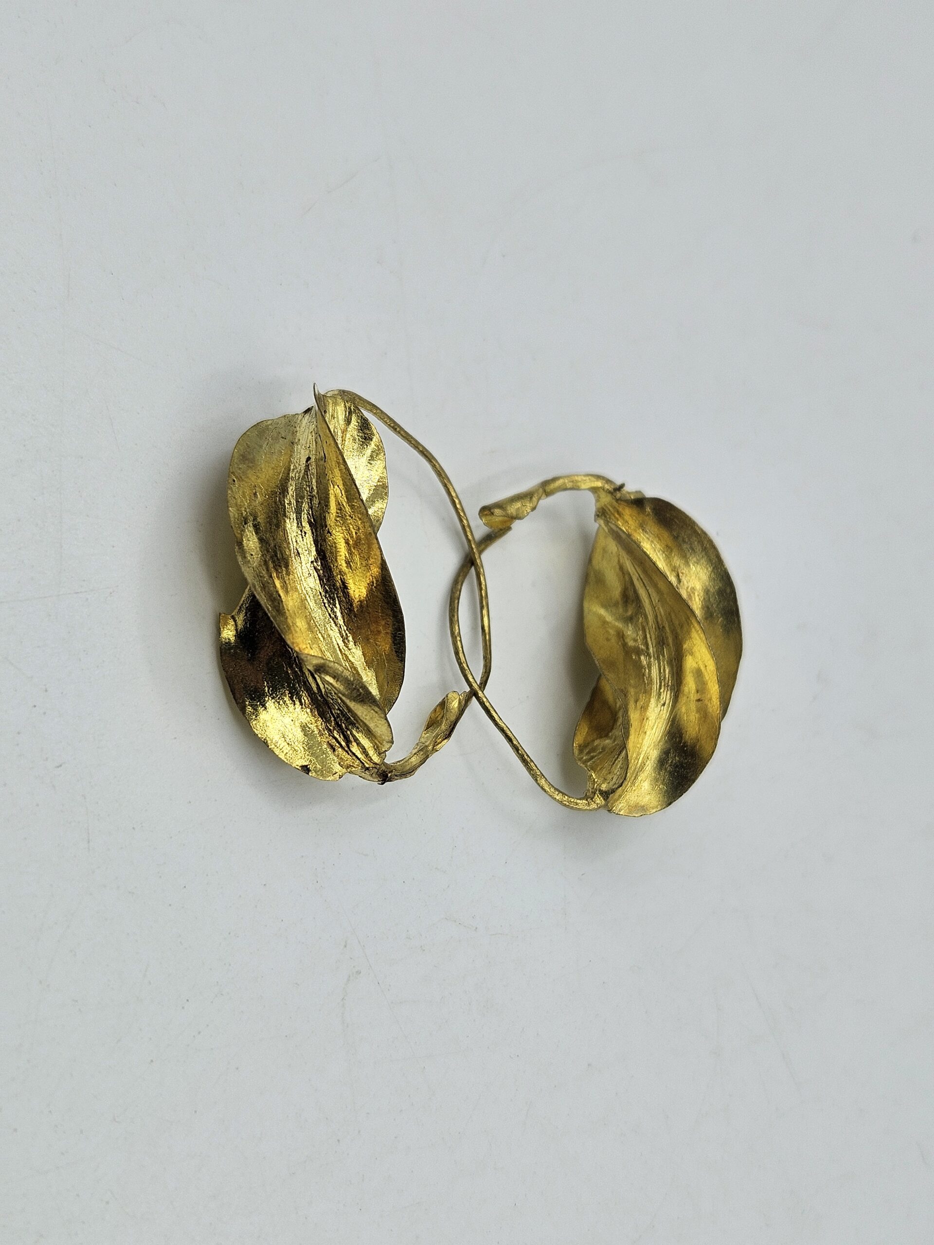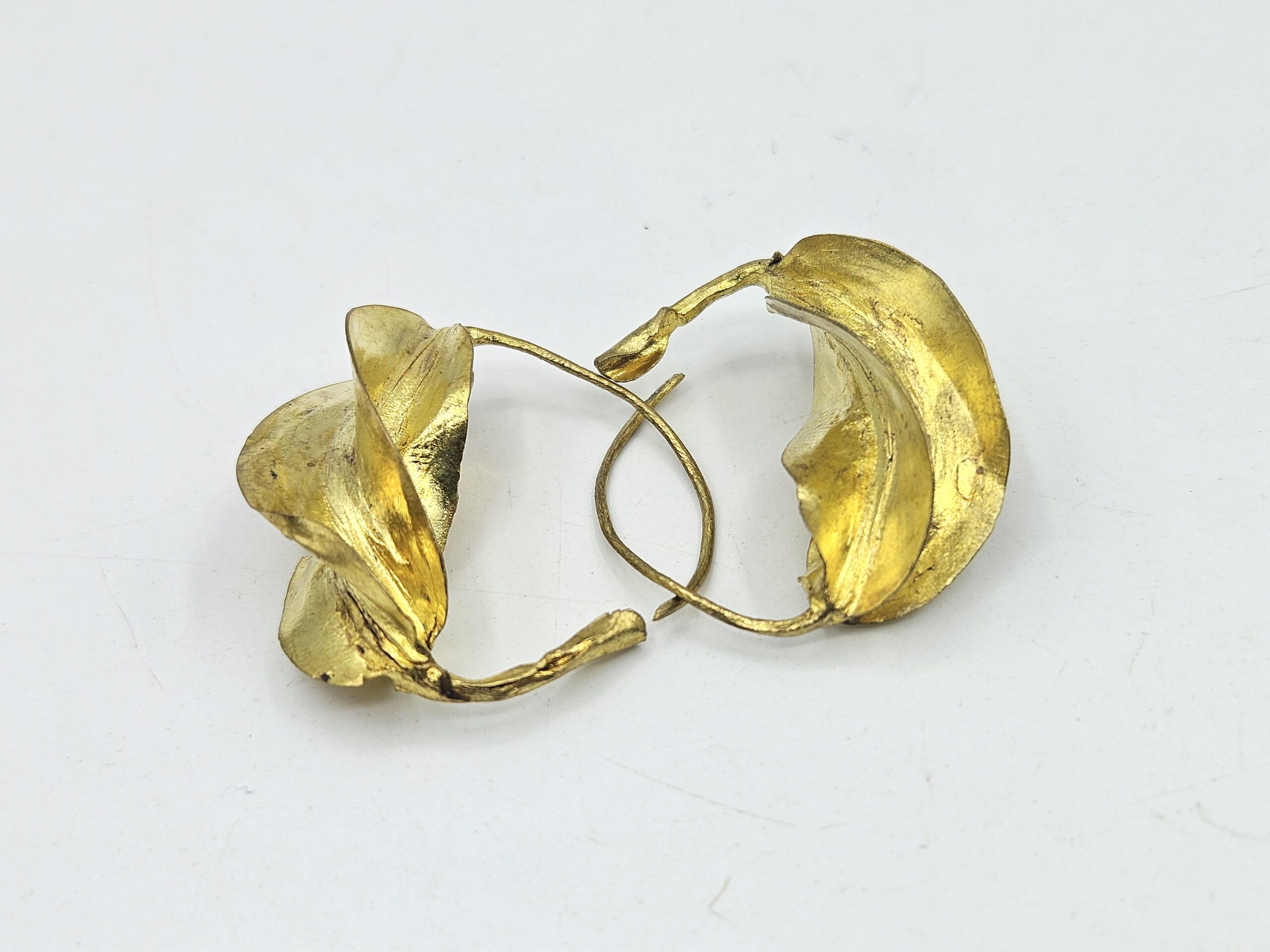 Questi orecchini sono realizzati in lega di ottone dorato, martellata e modellata a mano in una forma spiraliforme morbida e asimmetrica, tipica dell’estetica Peul.