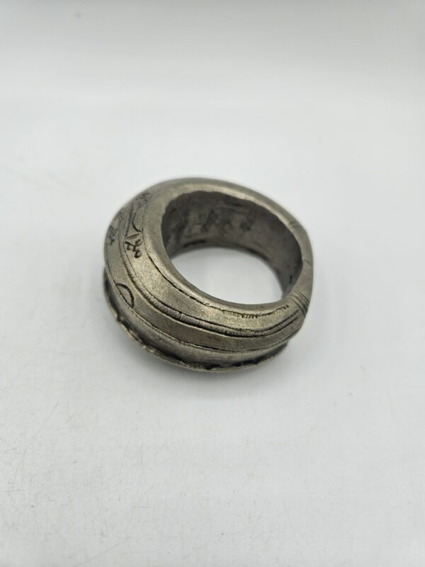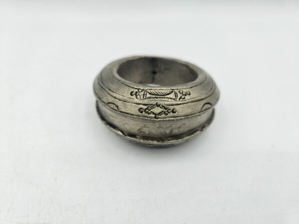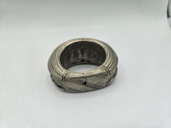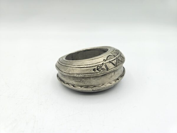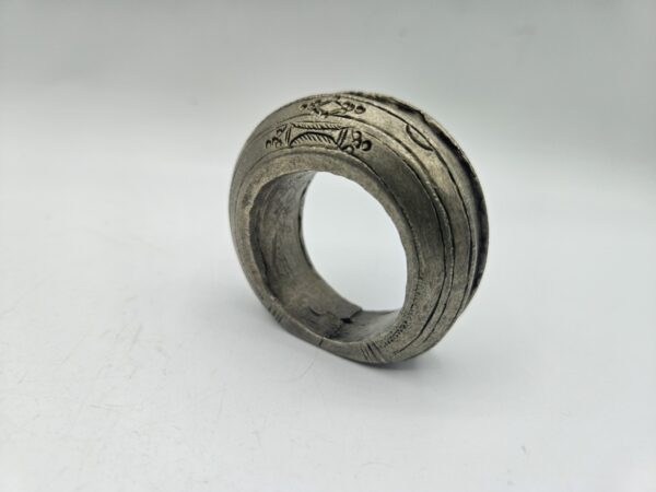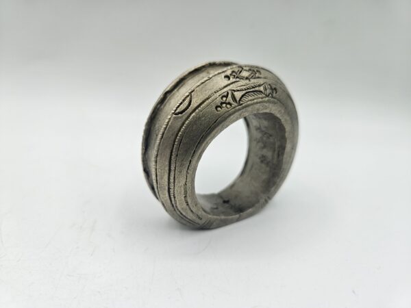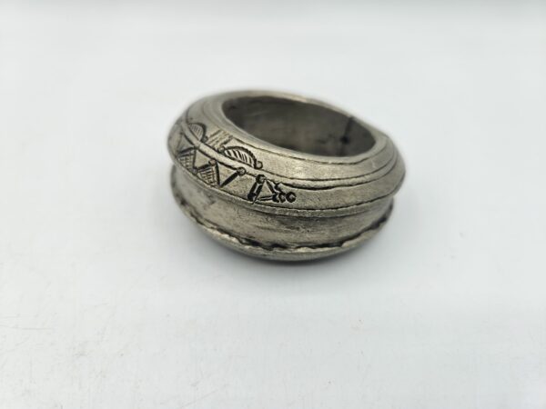 Il gioiello presenta una forma massiccia e compatta, con superficie incisa a motivi geometrici e simbolici. Questi segni, spesso realizzati a mano con punzoni e bulini, non hanno solo funzione ornamentale, ma racchiudono significati legati alla fertilità, alla protezione e all’identità clanica.