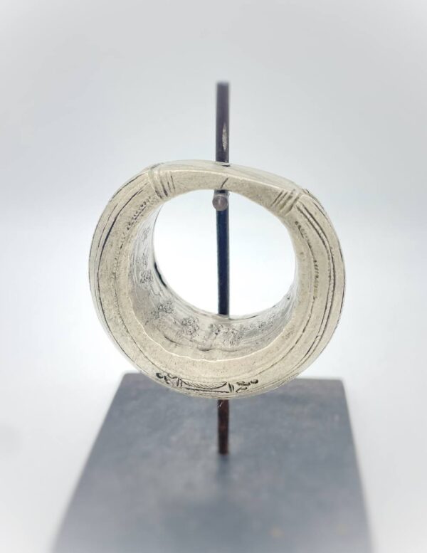 Questo pendente Fulani (Peul) proviene dalle regioni del Sahel, tra Niger e Mali, dove la tradizione orafa si tramanda da secoli attraverso le mani di artigiani nomadi. Forgiato a mano e inciso con segni geometrici regolari, l’oggetto riflette la sobrietà e la raffinatezza tipiche dei gioielli Peul.