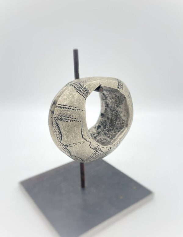 Gli ornamenti Peul venivano spesso indossati durante cerimonie o danze rituali e potevano rappresentare talismani protettivi o segni di appartenenza familiare. Il linguaggio decorativo — fatto di tratti incrociati, punti e incisioni parallele — si ispira alla natura e alle geometrie del tessuto sociale tribale.