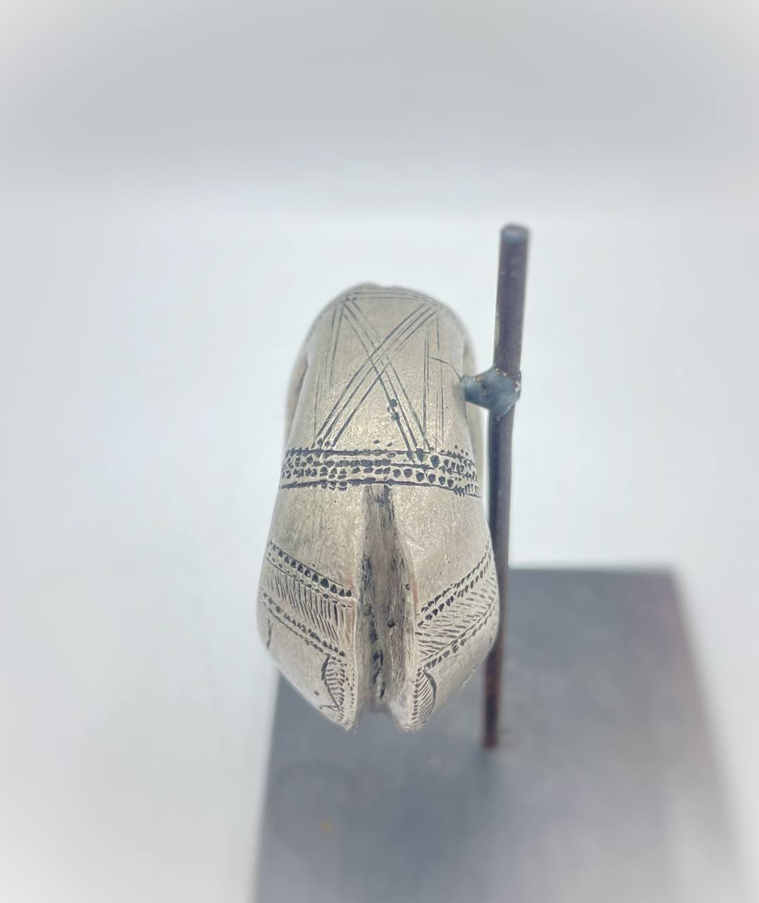 Pendente Peul (Fulani) di manifattura tradizionale, caratterizzato da superfici incise con motivi geometrici e linee sottili. Questi pendenti, realizzati a mano da abili artigiani dell’Africa occidentale, riflettono la maestria estetica e simbolica delle popolazioni Fulani, tra i più antichi e diffusi gruppi nomadi del Sahel.