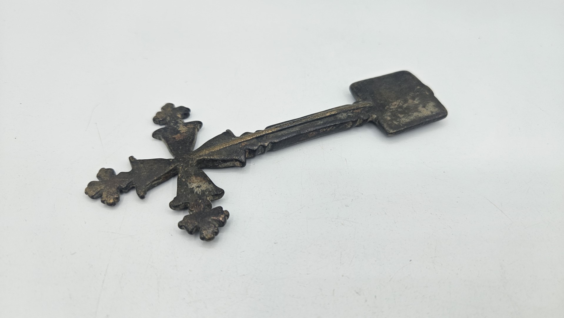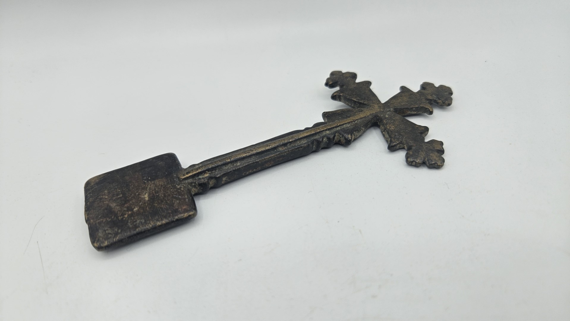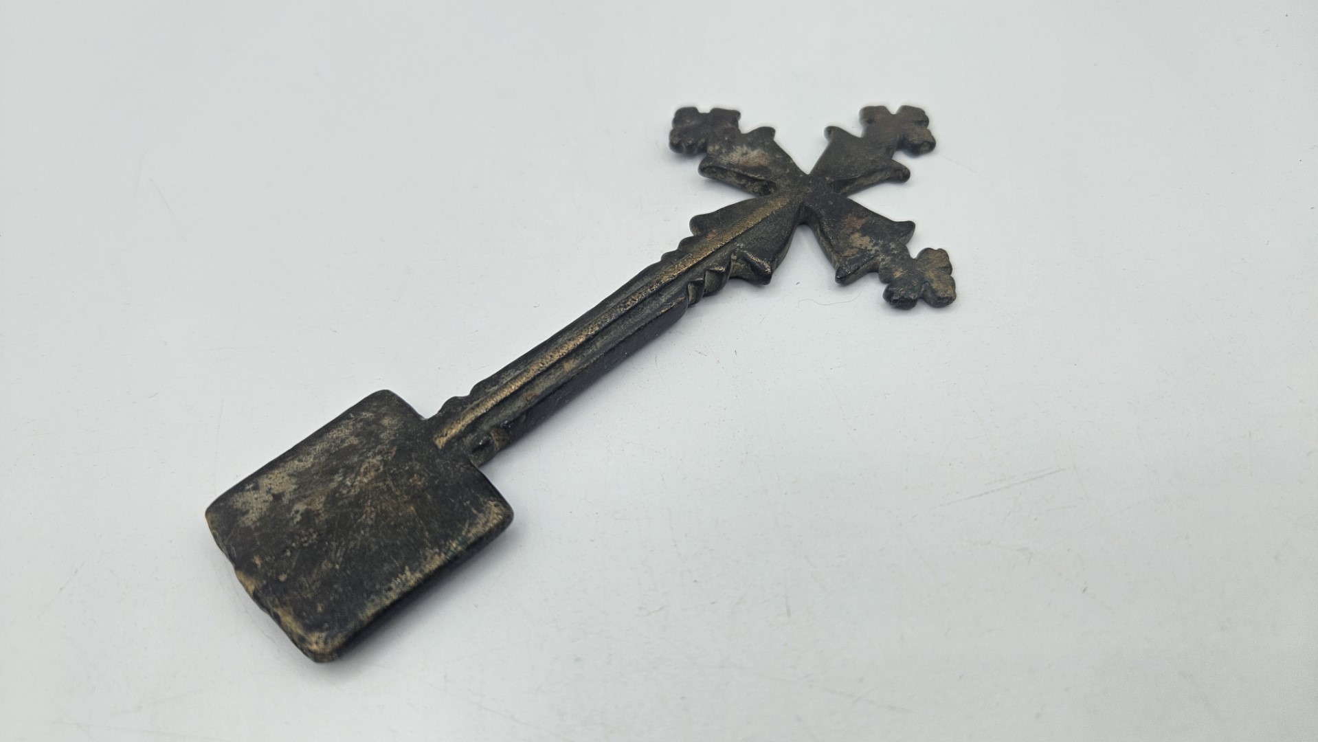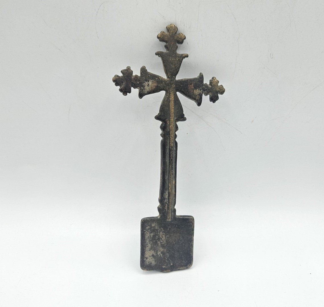 Piccola croce cristiana in bronzo proveniente dall’altopiano etiopico, riconducibile alla tradizione axumita. La forma è slanciata, con bracci espansi e terminali trilobati, un motivo tipico dell’iconografia cristiana etiope antica. Il fusto centrale è attraversato da una nervatura longitudinale che rafforza la verticalità dell’oggetto, mentre la base quadrangolare suggerisce un utilizzo come croce da appoggio o elemento devozionale domestico.
