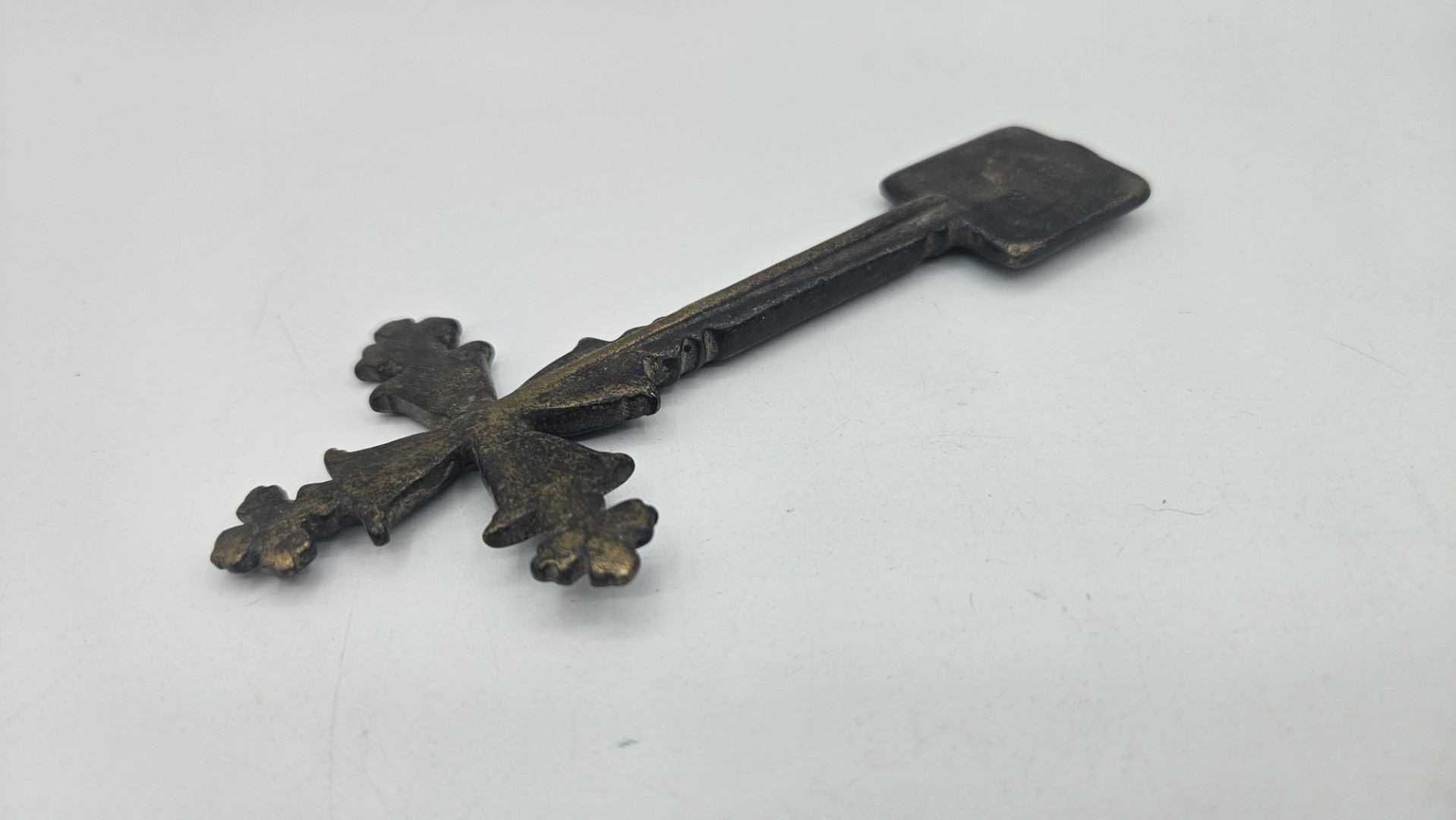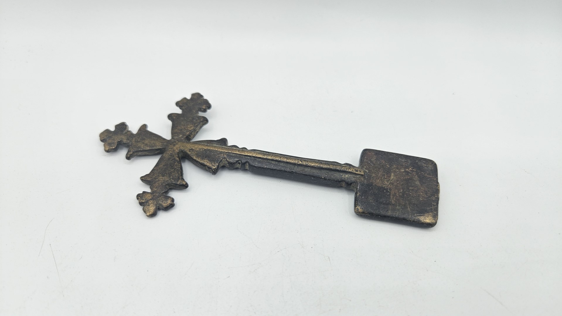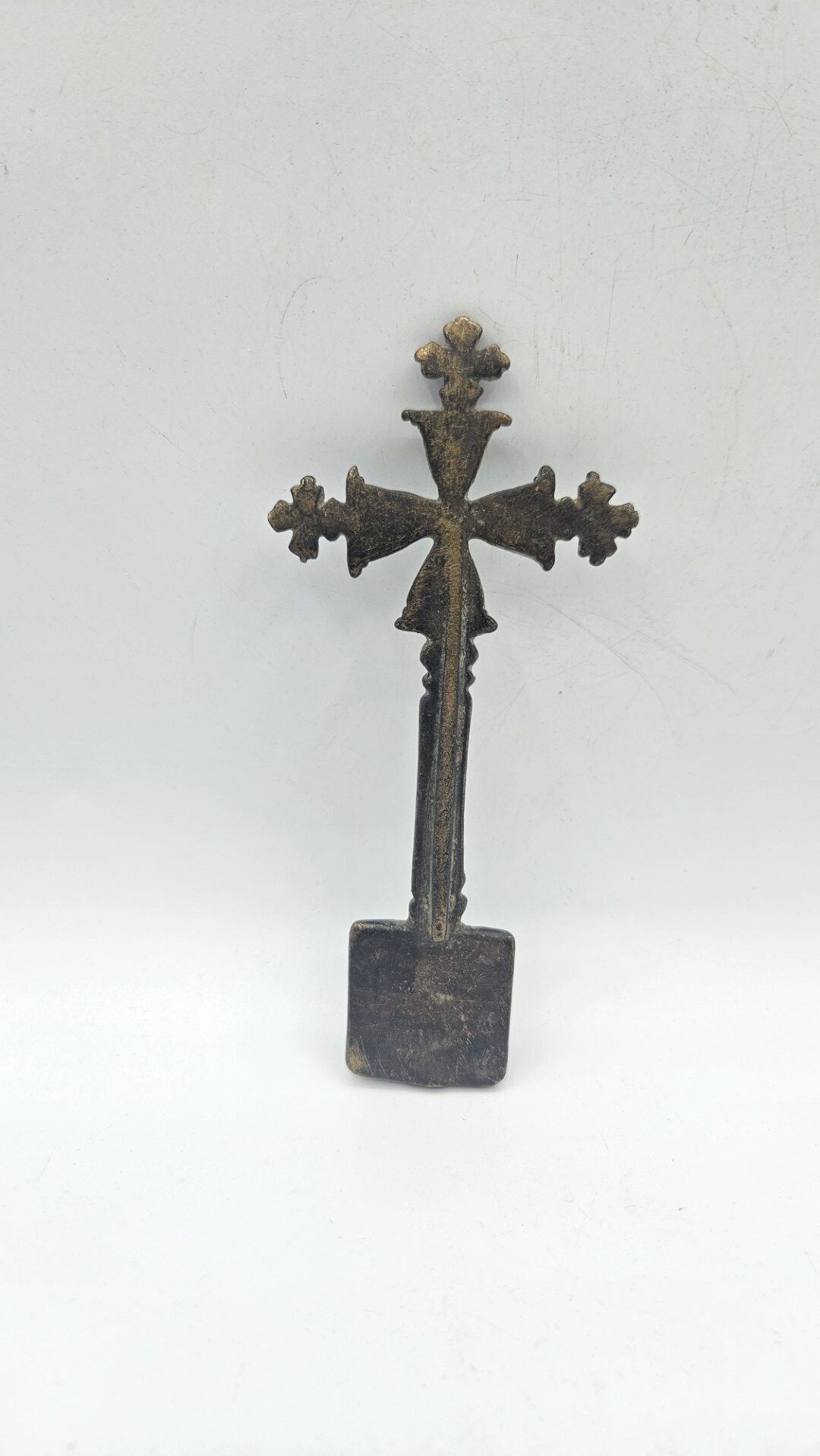 La lavorazione è realizzata per fusione, con una stilizzazione arcaica e proporzioni essenziali, espressione di una produzione antica legata alla diffusione del Cristianesimo in Etiopia e alla lunga continuità delle sue tradizioni religiose. La superficie conserva una patina scura e compatta, con ossidazioni e segni di usura coerenti con l’età e l’utilizzo prolungato nel tempo. Segni di uso evidenti che ne danno carattere forte