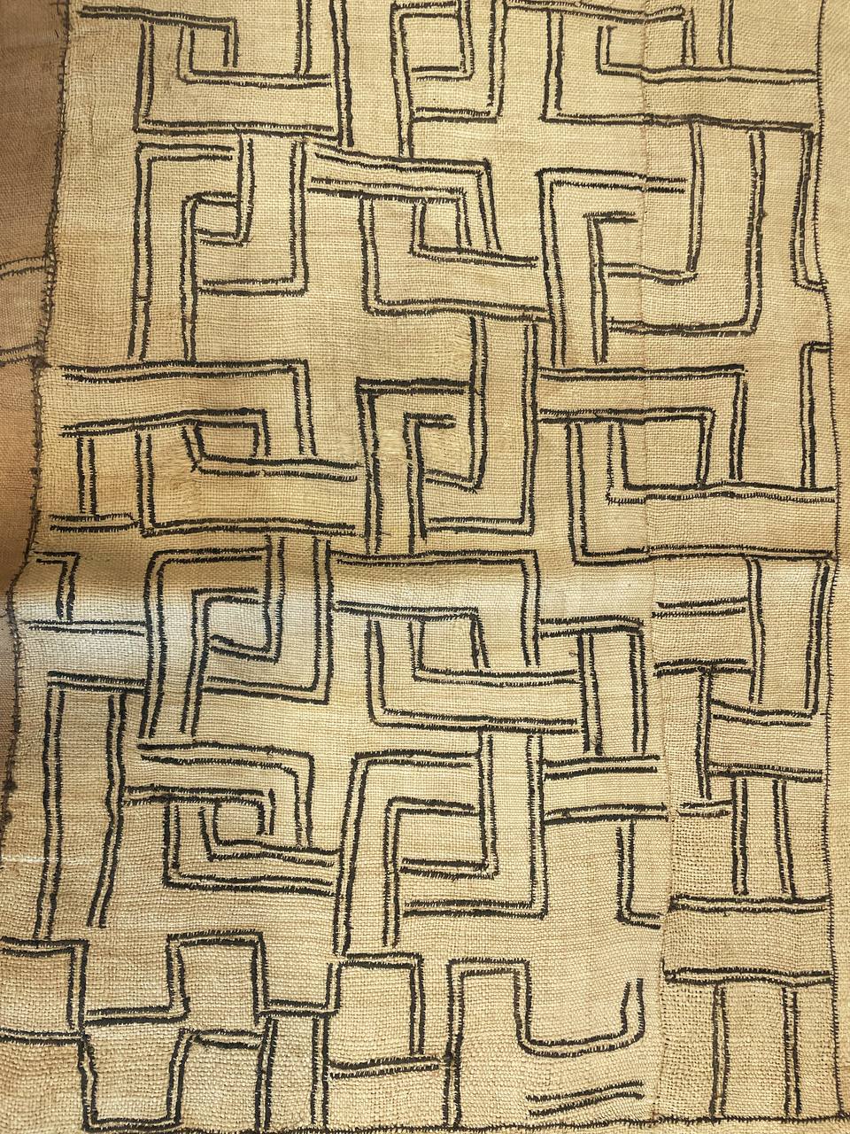 Realizzato in rafia naturale intrecciata e dipinto con pigmenti vegetali neri, il tessuto presenta un complesso motivo geometrico a intreccio e labirinto, tipico dell’arte Kuba.