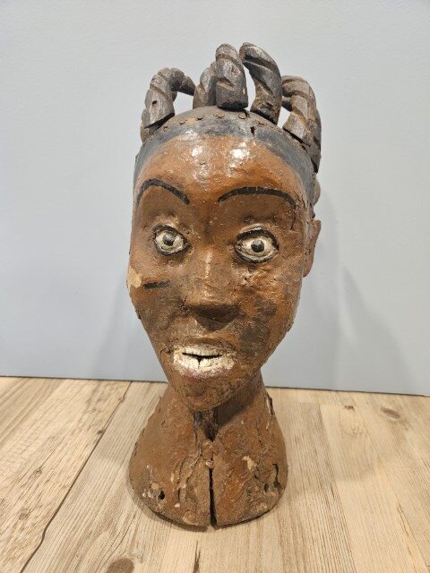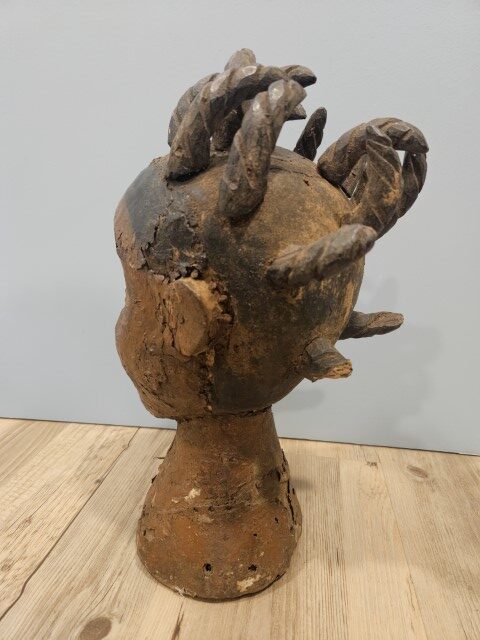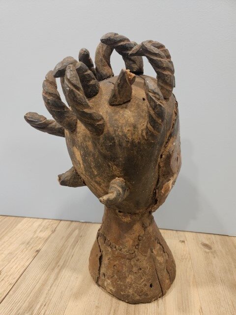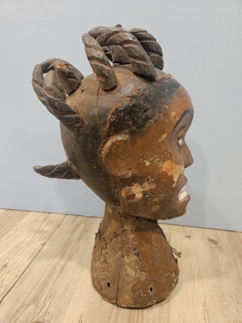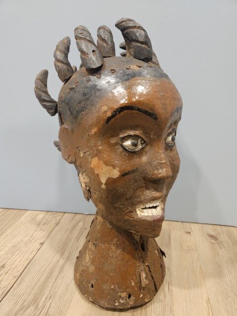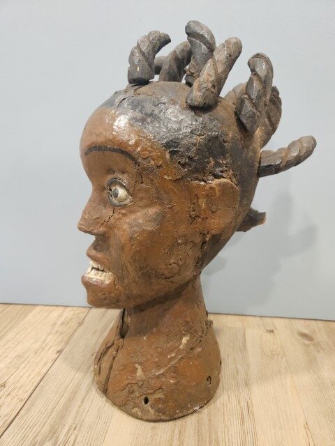 Realizzata in legno scolpito, un tempo rivestito di pelle animale (generalmente d’antilope) e dipinto con pigmenti naturali, questa scultura si distingue per i lineamenti accentuati e l’intensità dello sguardo. Gli occhi sporgenti, la bocca serrata e la capigliatura a ciocche spiraliformi evocano la potenza degli spiriti che la figura rappresentava.