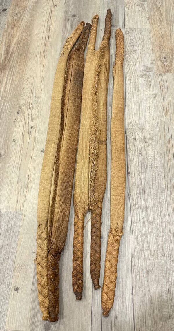 Set di cinque valute di scambio Babunda (Congo) in fibra vegetale intrecciata, di cui due con segni di utilizzo rituale e tre in ottime condizioni. Queste rare monete tradizionali erano impiegate come mezzi di scambio, doni cerimoniali o simboli di status presso le popolazioni Babunda e Yaka.